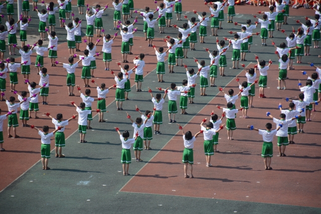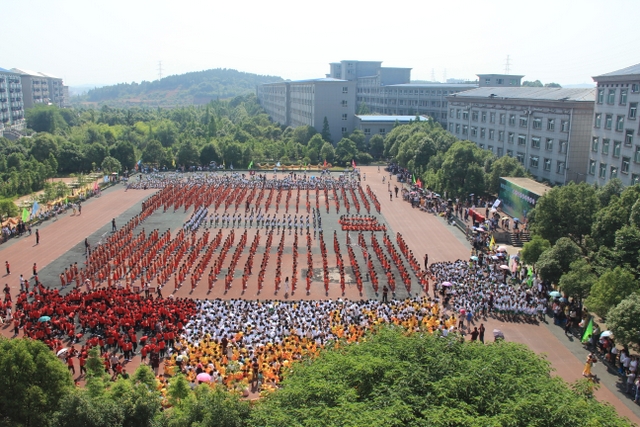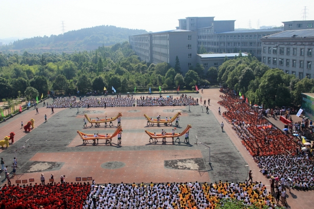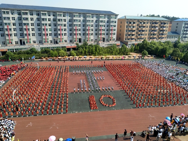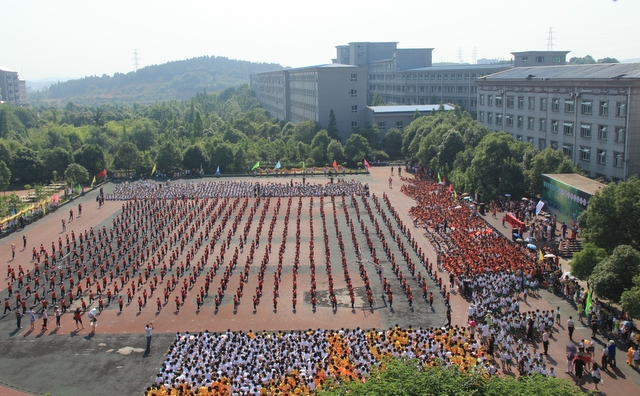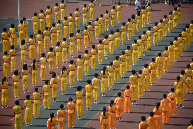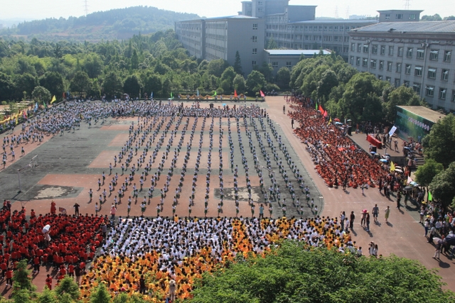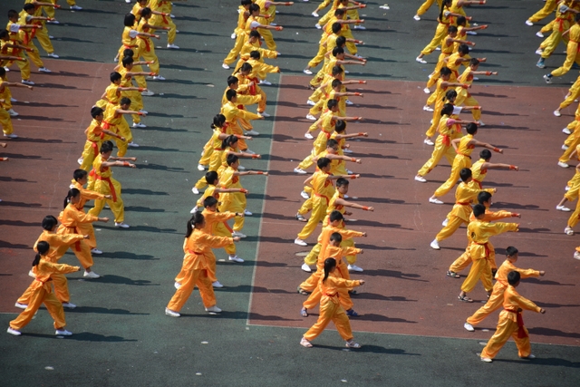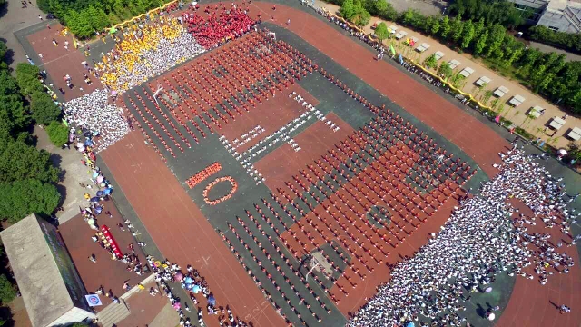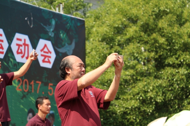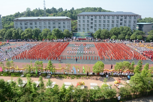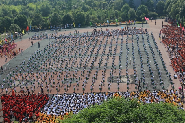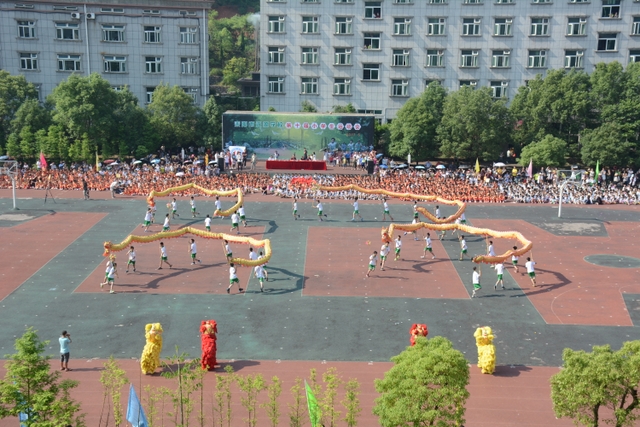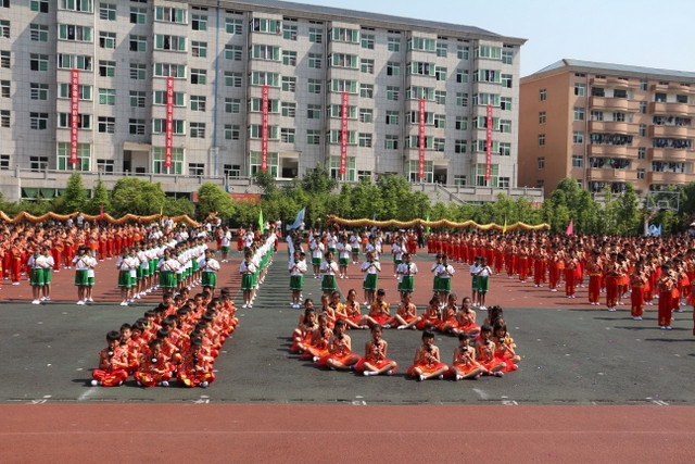 三年级全体学生628人表演五步拳。鲜红的上装,漆黑的运动裤,雪白的运动鞋,色彩鲜明。在台上指导老师的指令下,台下学生敬礼,礼毕,左弓步出拳,右弓步出拳……口令刚劲有力,动作虎虎生风,一曲《中国功夫》的伴唱更是把氛围推向极点。