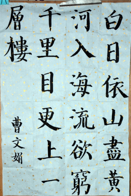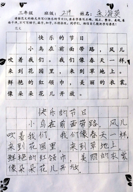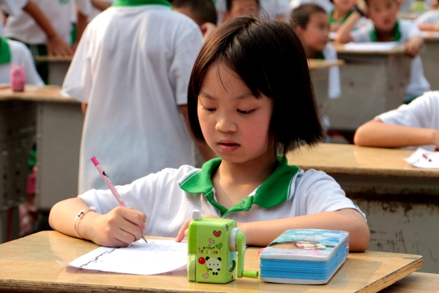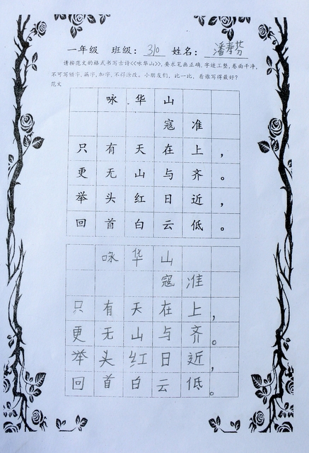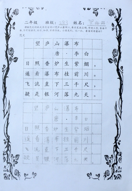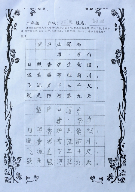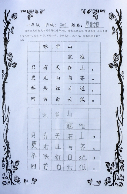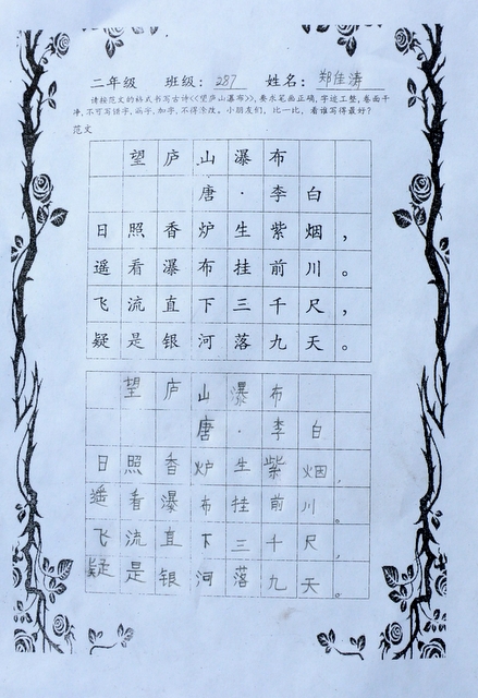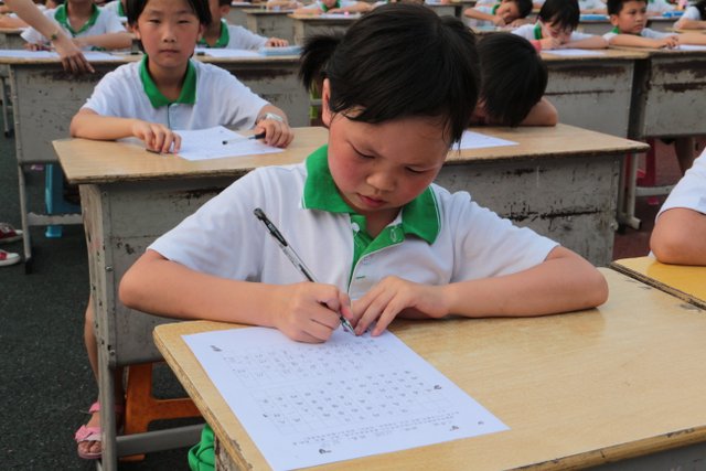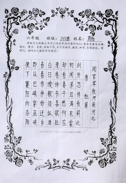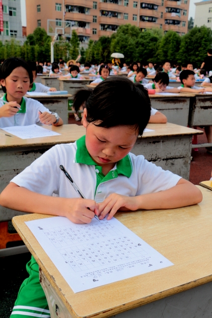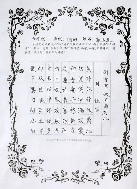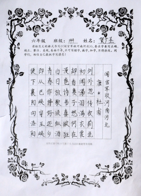 六个年级均有学生参赛。一年级100人,二年级140人,使用铅笔书写,内容分别为寇准诗《咏华山》和李白诗《望庐山瀑布》;三年级160人,六年级280人,使用0.5黑色中性笔书写,内容分别为散文节选《快乐的节日》和杜甫诗《闻官军收河南河北》;四年级140人,五年级160人,六年级20人,使用毛笔书写,内容为王之涣诗《登鹳雀楼》。笔者随机采访了几个参赛同学,一个个自信满满,志在必得,均表示平时很喜欢书法,一点也不怯场。