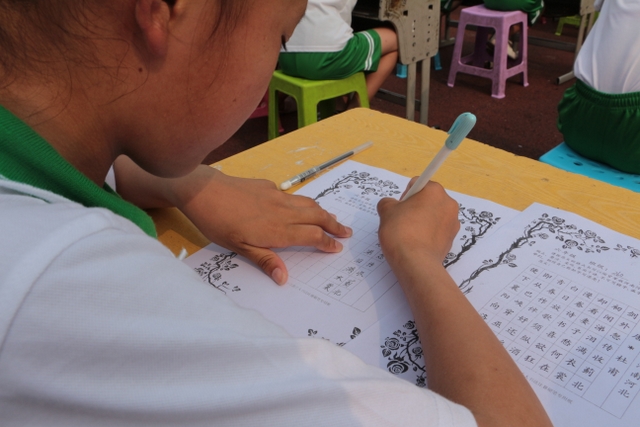 4:00整,比赛正式开始。阳光炽烈,脸上渗出汗珠,同学们不屑一顾。微风吹拂,不时撩起书写的宣纸,同学们耐心地拂平再写,一而再,再而三,不厌其烦。笔者穿行其间,看同学们的表情都是那么认真,一丝不苟,一笔一画中规中矩,一招一式有模有样,不少同学功力不凡,头角崭露。