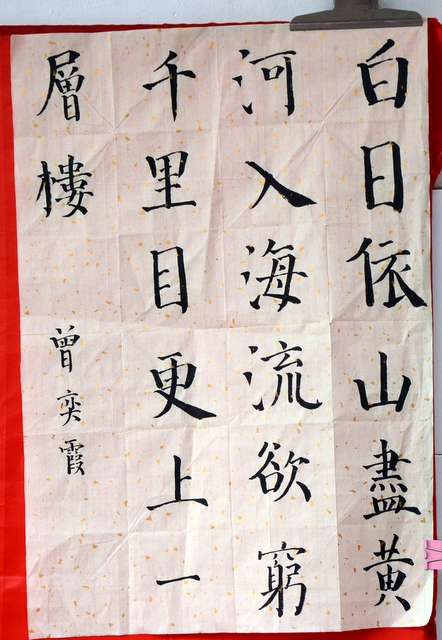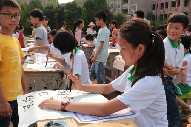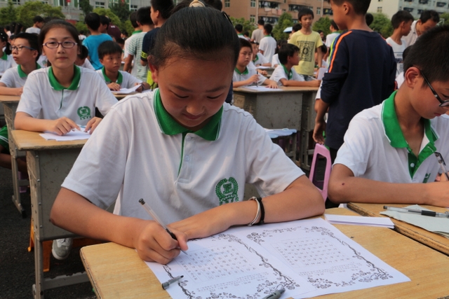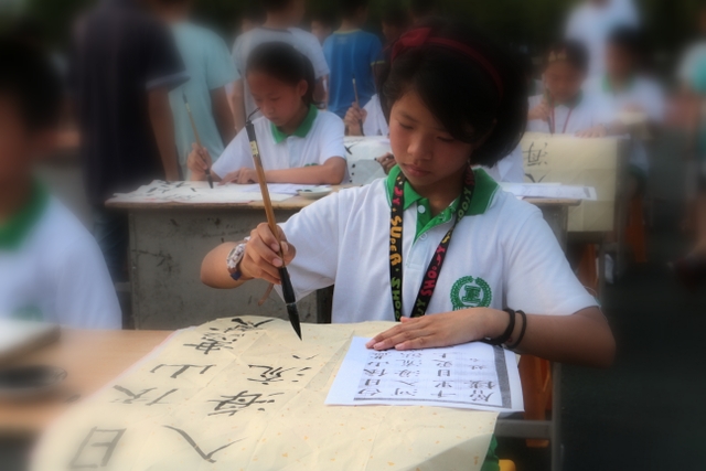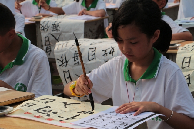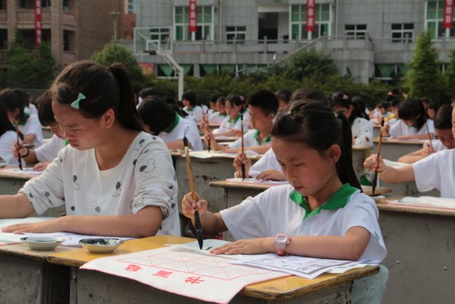 十分钟后,未能参加比赛的同学分两路开始参观比赛,现场目睹参赛同学的风采。采访没有参赛的同学,有的说自己写的书法还不够好,有的说班上名额不够没有安排自己。问他们练习书法有什么好处,一个女生说:对将来的高考有好处。同学们居然联想得这么深远,可见同学们的书法意识有多强。书法教师黄老师说,书法艺术在我国具有五千多年的悠久历史,是中华民族的国粹,学校这么重视,我们要让同学们学好书法,弘扬国粹。