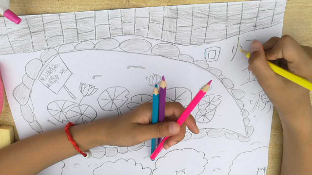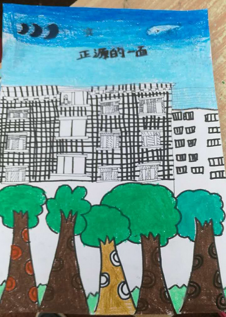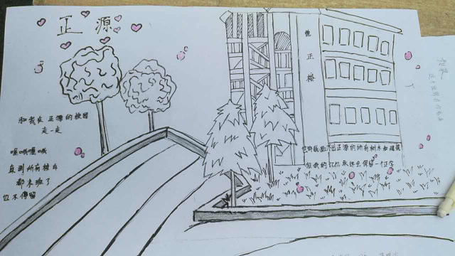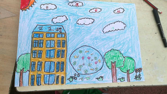 笔者在巡视的过程中,不时为同学们丰富的想象、巧妙的构思、精工的用笔、协调的着色所吸引,所惊叹。六年级254班贺思捷同学画的是学校的荷花池塘,画面上题着:接天莲叶无穷碧,映日荷花别样红。还写着:老师就像无私奉献的荷花,培育了许多美丽的小荷花,望以此画感谢老师。三年级221班龙冰雪画的也是《美丽的池塘》,池塘里小蝌蚪摆动尾巴自由游动着,或群游,或单枪匹马。小鱼则在玩“O”字造型,仿佛有鱼在导演似的。池塘里的水被微风吹拂,皱起一层层波澜。池塘周围是小树和石板路……学生观察事物是多么细致。一年级313班贺少灵同学画的是《家(校)园》,教学楼左上角是一轮红日,画面上方是蔚蓝的天空点缀着朵朵白云,画面中间有飞舞的蝴蝶和蜻蜓,下面有一束一束的鲜花和小草,两边有小树,好一个温馨的世界。一年级315班周丹桦同学,在画面上写着:正源学校bangzhu我学习,peiban我成长,我爱正源学校。小小年纪,连汉字都写不全,就懂得感恩,可见正源学校对孩子们的影响有多么深刻。
