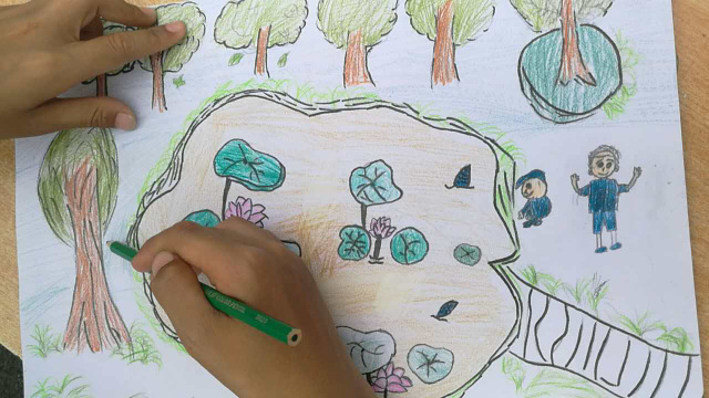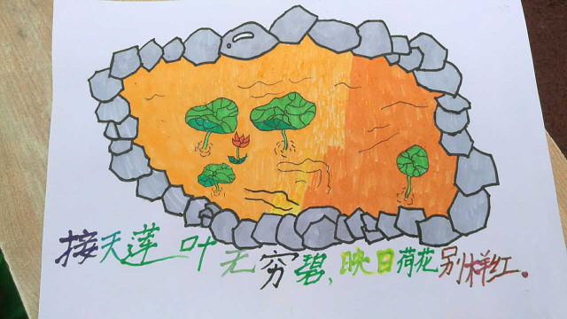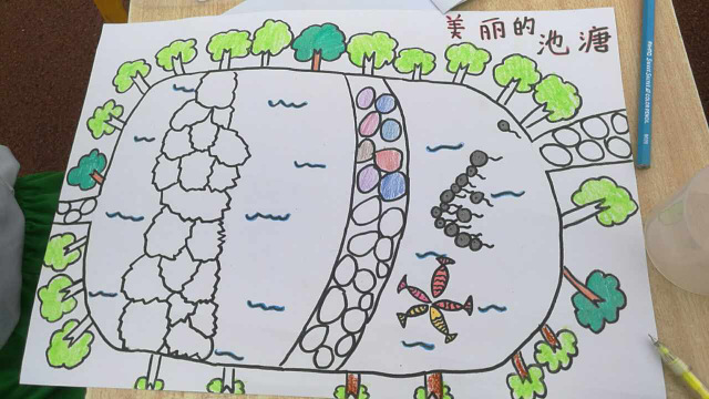 三年级216班彭诗琪同学画的也是《美丽的正源池塘》,红日,白云,蓝天,垂柳;平展的荷叶,盛开的荷花,含苞待放的荷花,长着毛刺的荷梗,尚未成熟的莲蓬……物象丰富,色彩鲜艳,画面清新,让人目不转睛,叹为观止,不忍离去。