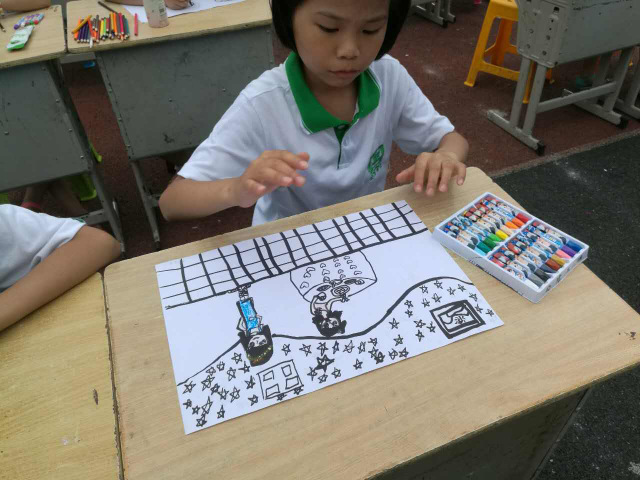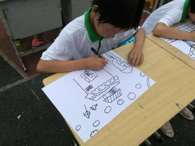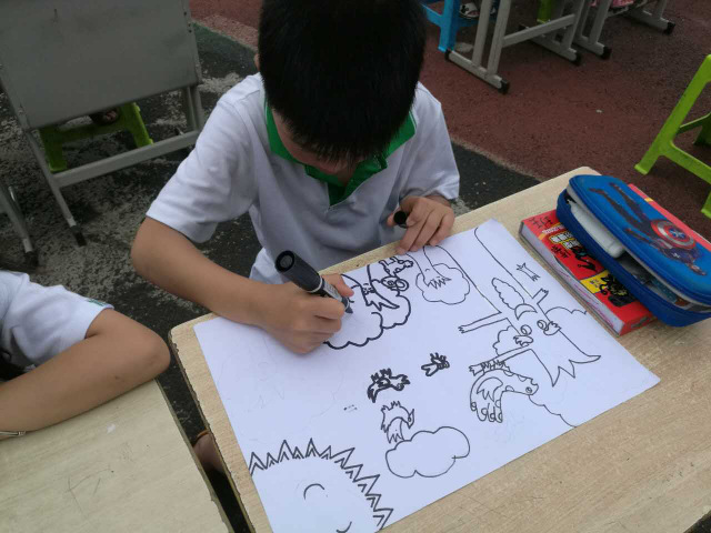 参加本次绘画大赛的1000名学生,包括:一年级90人,二年级100人,三年级120人,四年级168人,五年级222人,六年级300人。经过短时练笔后,九点半钟大赛正式开始。小学部美术备课组组长吴蓉芳老师宣布了本次大赛的主题:《我们的学校》,讲了基本要求。同学们随即进入沉思。片刻之后,同学们陆陆续续开始勾勒线条,画出结构,填充色彩,题写主题词,一切紧张而有序。