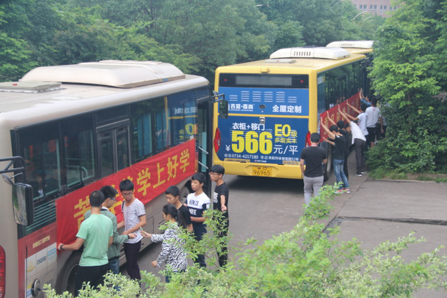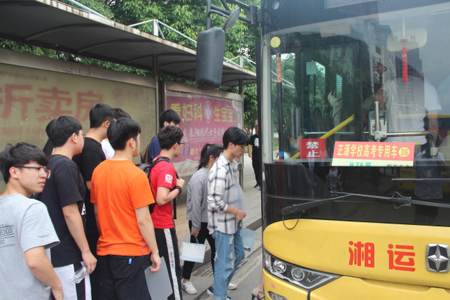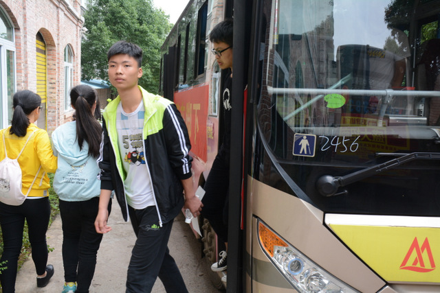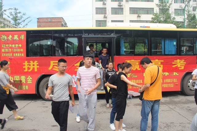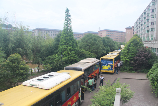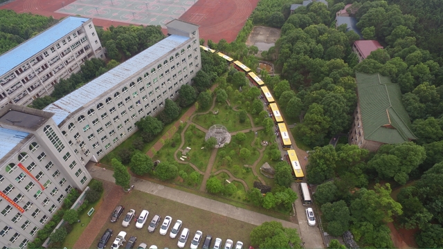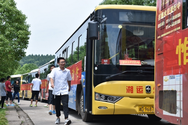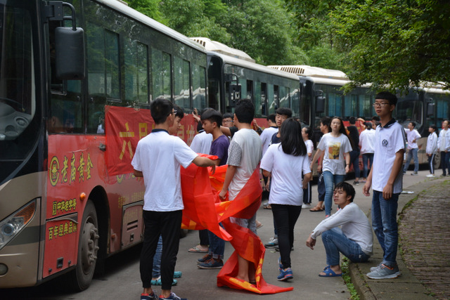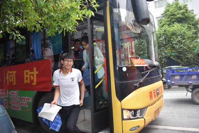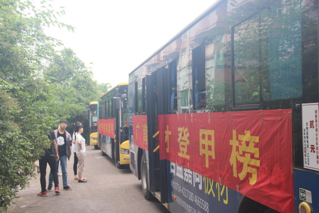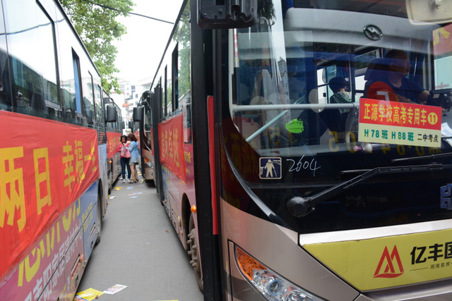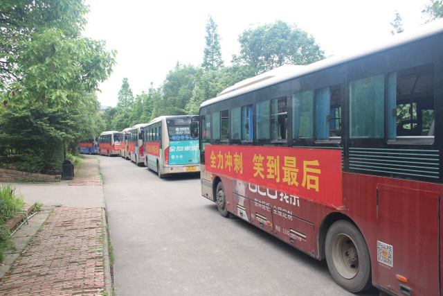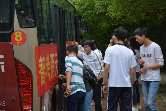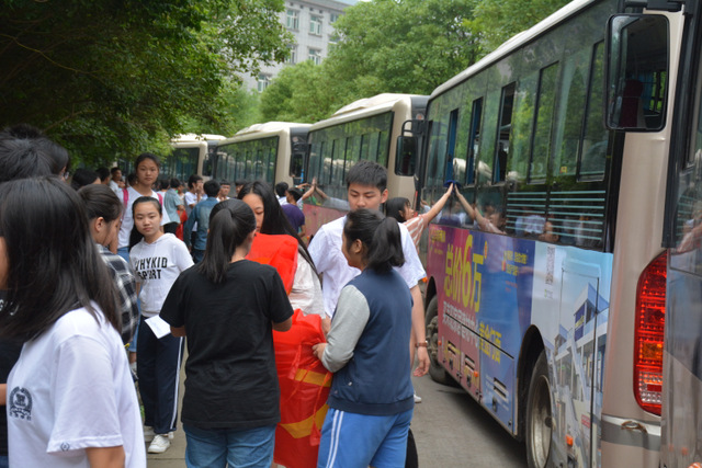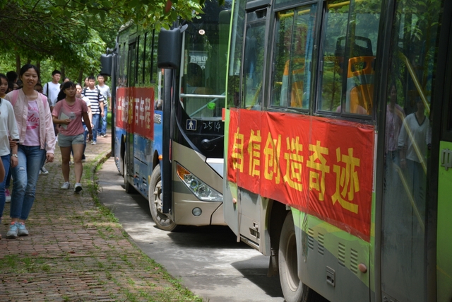 8:08分,在罗校长一号车带领下,由一中考点、二中考点、职高考点等三路43辆车组成的车队,依次从不同的方向,经学校南校门驶出,奔赴考场,同学们脸上洋溢着自信的笑容。