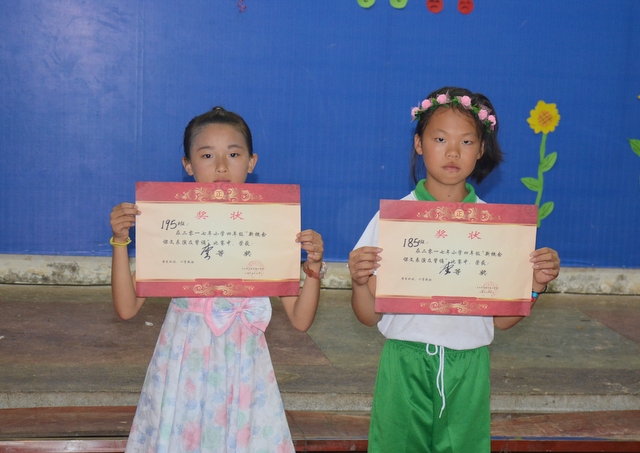 来自其它各个年级的5位评委老师,根据参赛选手的发音,表演内容、语言感染力等细则,评选出一等奖2名,二等奖4名,三等奖8名,四年级领导当场为获奖班级颁奖。