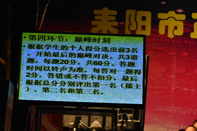 第四环节“巅峰对决”,通过前三环节的比拼选出个人得分前三名的选手进行对决,选出擂主。本环节一开始气氛一下子就紧张起来,台下的观众受到感染,不知不觉的安静下来,生怕打扰到选手。经过激烈的角逐,最终由谢岩峰同学获得擂主,台上台下一时间掌声雷动,经久不息,这是对强者的赞美,对付出的心血的最好肯定!