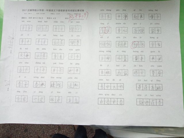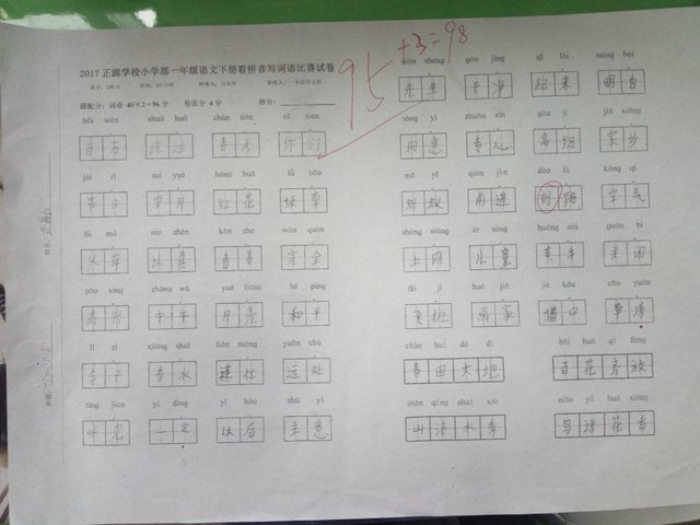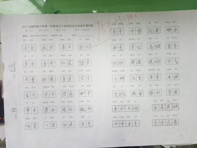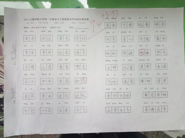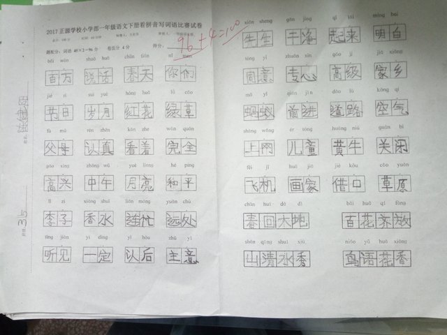 本次参赛对象为一年级全体学生,内容是以拼音呈现的48个难度适中的词语, 均为已学过并要求学生能正确书写的二字词语或四字词语,要求学生卷面整洁、美观、无皱褶。竞赛题配分为试题96分,卷面4分。为了公平、公正,比赛采取本年级老师交换监考,语文组老师集体阅卷的形式。