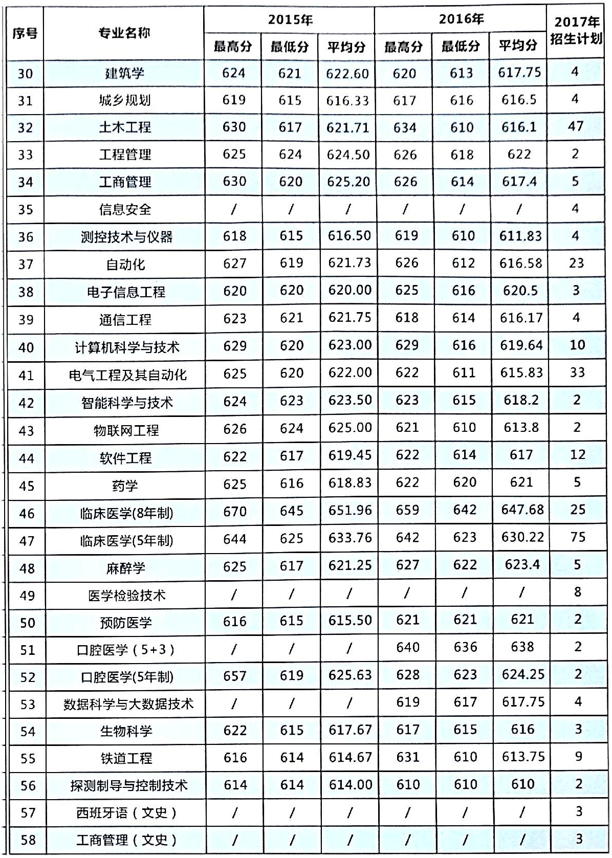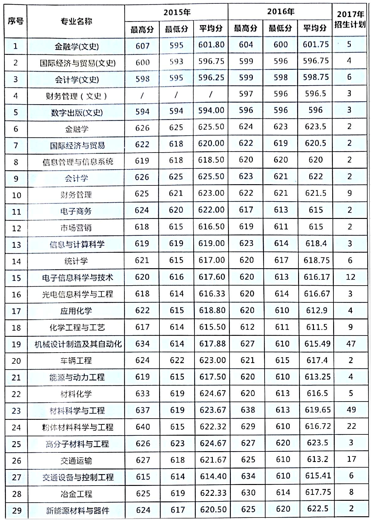 中南大学湖南2015~2016年专业录取分数及2017年招生计划一览表