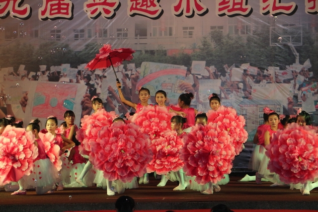 随着十几个同学撑着硕大粉红鲜花图案的纸伞翩翩起舞,演出拉开帷幕。她们曼妙的舞姿,轻盈的身影,绚丽的色彩,空灵的音乐,瞬间将全场观众拉入到了如梦似幻的花之王国……