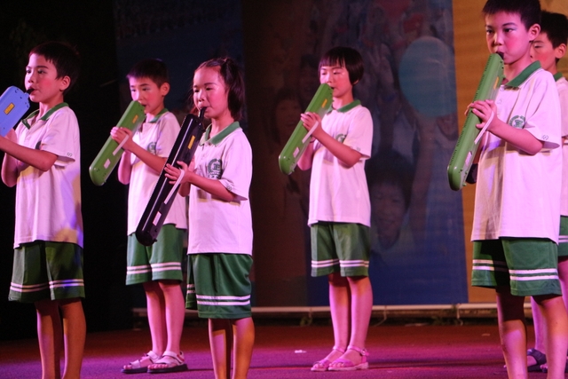 有器乐演奏:口风琴合奏《do er me》,笛子合奏《打靶归来》 《共产儿童团歌》,吉他、尤克里里合奏《欢乐颂》 《一分钱》 《掀起你的盖头来》 ,这些小小乐器先后在场上响起或威武雄壮之音,或柔美轻缓之音,或欢快活泼之音,也如同赶趟儿似的争先亮出属于自己的特色之声韵,同学们沉浸在美妙的旋律之中如醉如痴。
