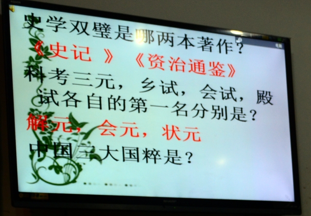晚上7点20分,“一战到底”的百科知识竞赛总决赛正式开始。由高132班李扬和高113班章怡萱两位同学主持。竞赛内容丰富多彩,既有文史哲等文科方面的知识,又有数理化等自然科学方面的内容,既有学生课本方面的知识,又有许多课外读物方面的内容,源于课本又高于课本。决赛中,8位同学采取擂台赛的形式,一对一捉对撕杀,战得高潮迭起,一浪高过一浪。经过两个半小时的激烈比拼,最终H1609班张世杰同学一举夺魁,成为最后的擂主,荣获“战神”称号;H132班陈雄同学以全场最高答题数位列第二,荣获“题霸”称号;H126班蒋文军同学位列季军。当主持人李扬大声宣读完总决赛获奖名单时,大厅里掌声雷动,送去了声声祝福。