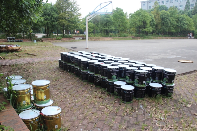 今年学校粉刷任务重,工时紧,花费了大量的人力、物力、财力,光人力学校就安排了生活老师及其它杂工人员70、80人,专门的粉刷师傅20多人;粉刷先用富士粉打底,然后再用无公害墙漆粉墙面,光购买无公害墙漆就达1100多桶。