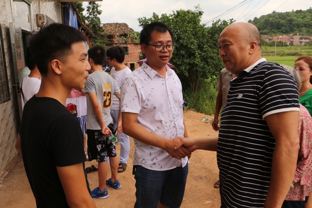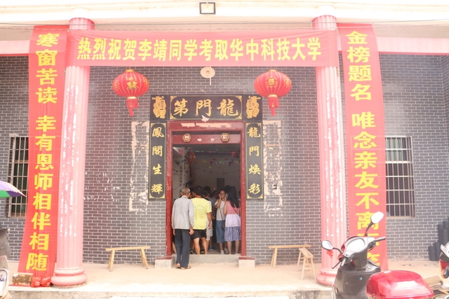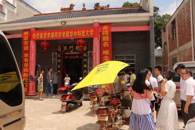 8月13日, 正源学校高82班班主任曾晓晖等一行人驱车赶往新市镇湾里村,热烈祝贺李靖同学考取华中科技大学。