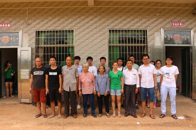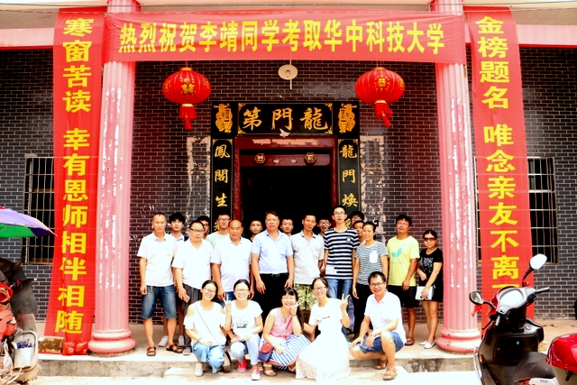 曾晓晖等老师与李靖的父母亲戚同学合影留念后,匆匆赶往该镇横龙村祝贺贺鑫同学考上广东工业大学。