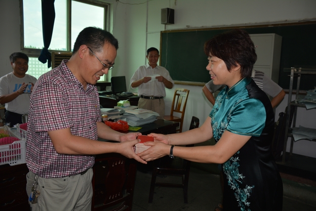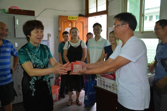 高一年级主任王小灿从梁老师手中接过厚厚的慰问金