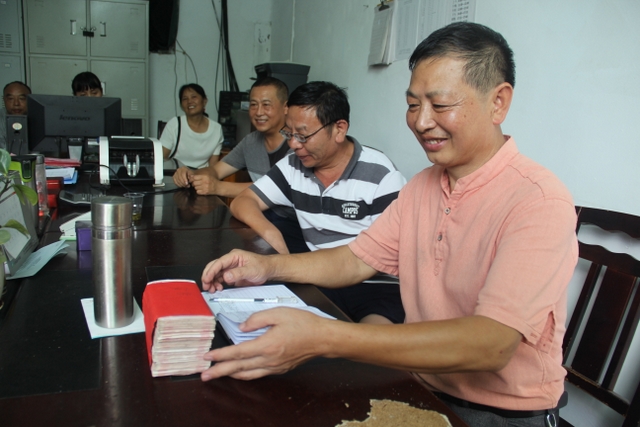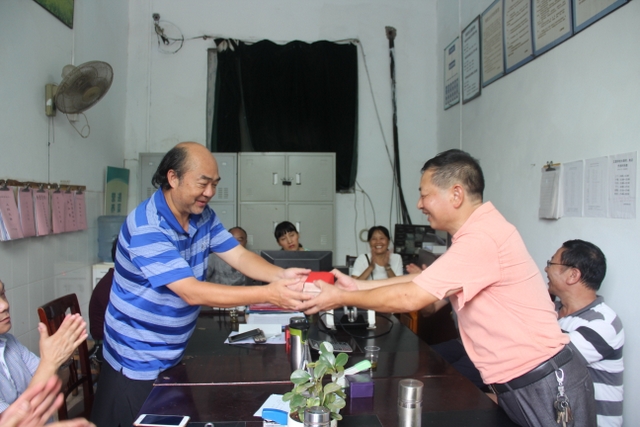 宿管部主任周文根高兴从罗校长手中接过生活老师慰问金