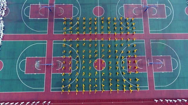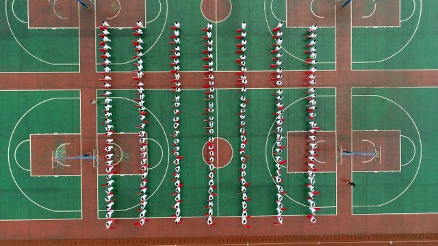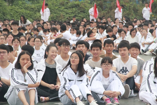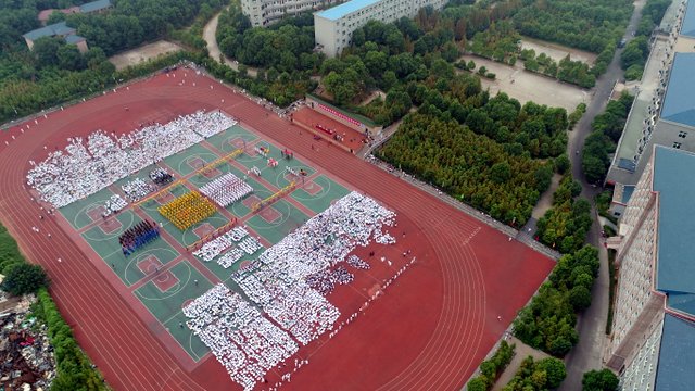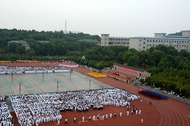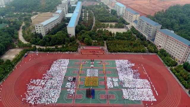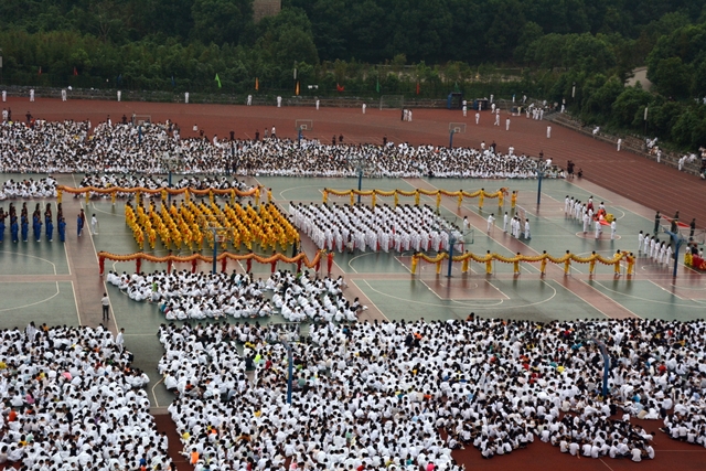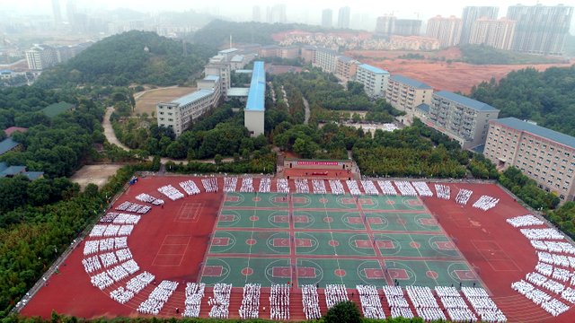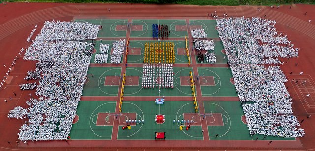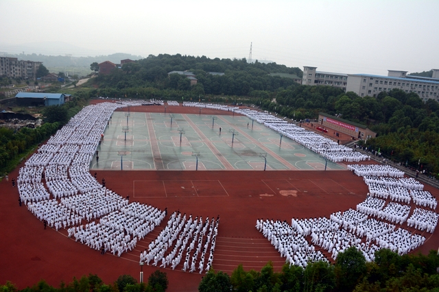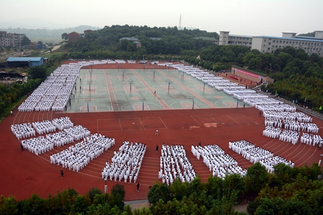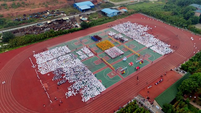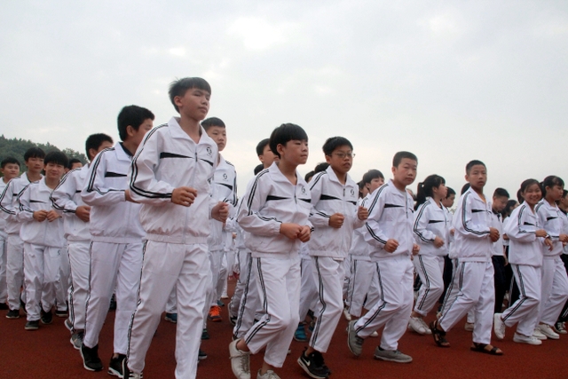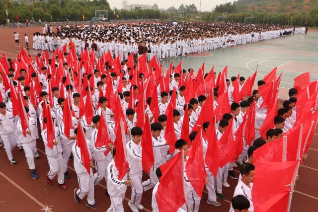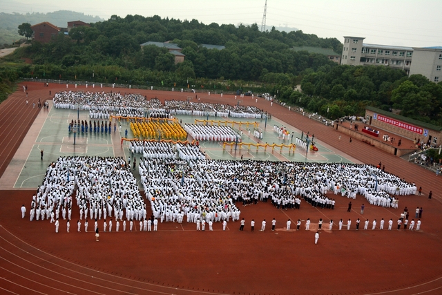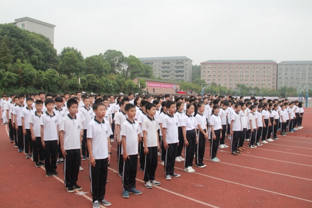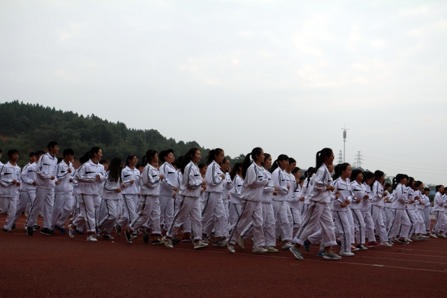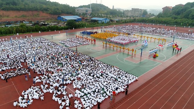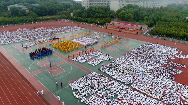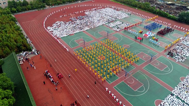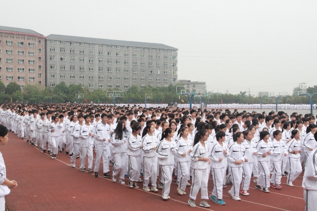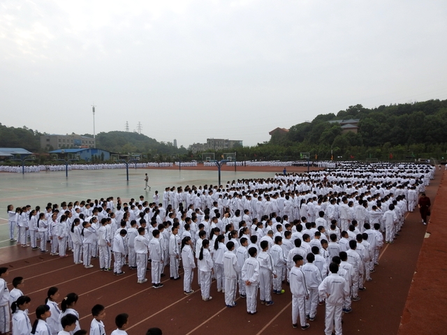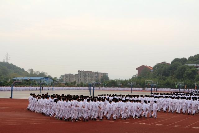 早上7:30分,统一身着白色校服,从准初一到初三、从准高一到高三共八个年级的全体11000名学生,在学校中学生运动场列队组阵,精神抖擞,整装待发。