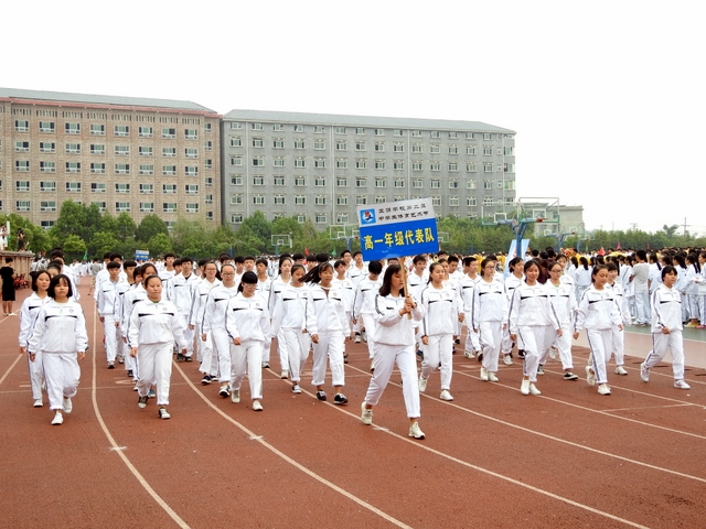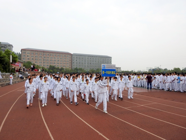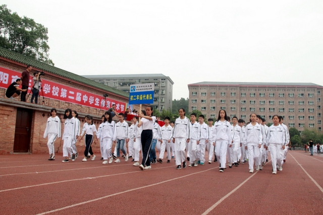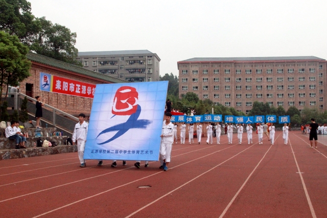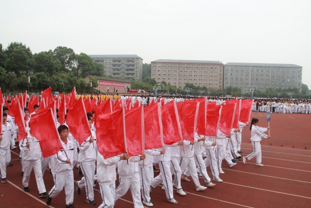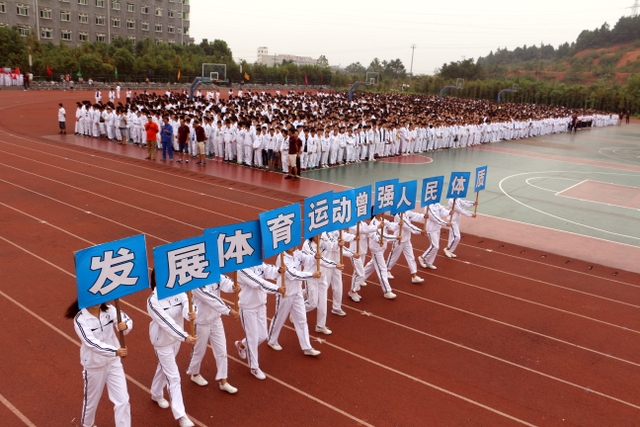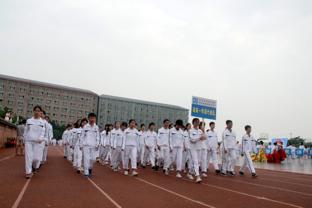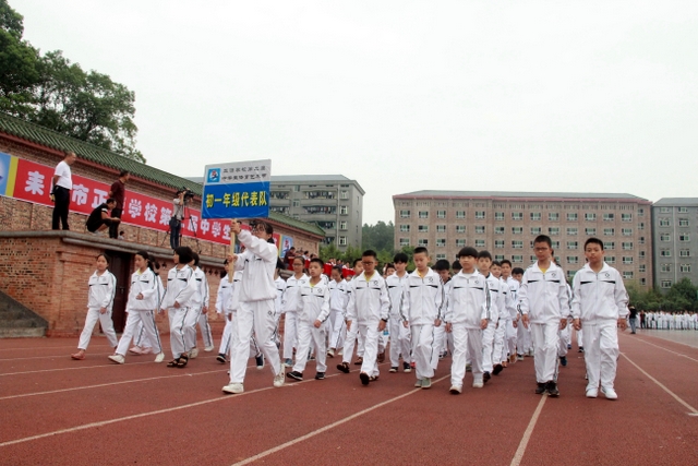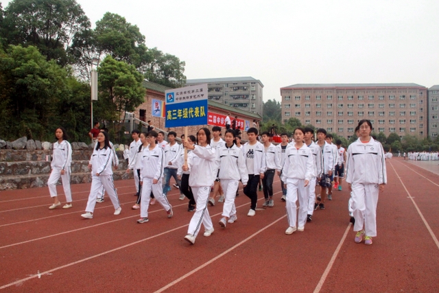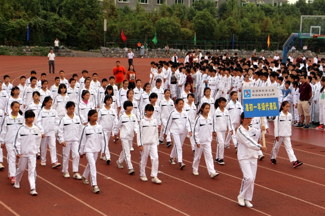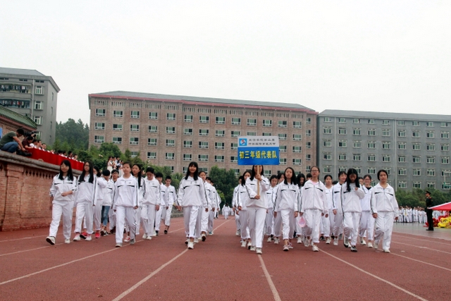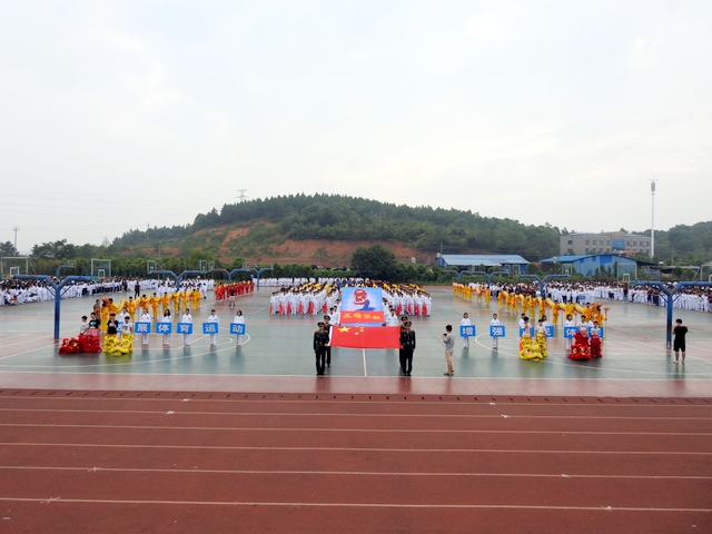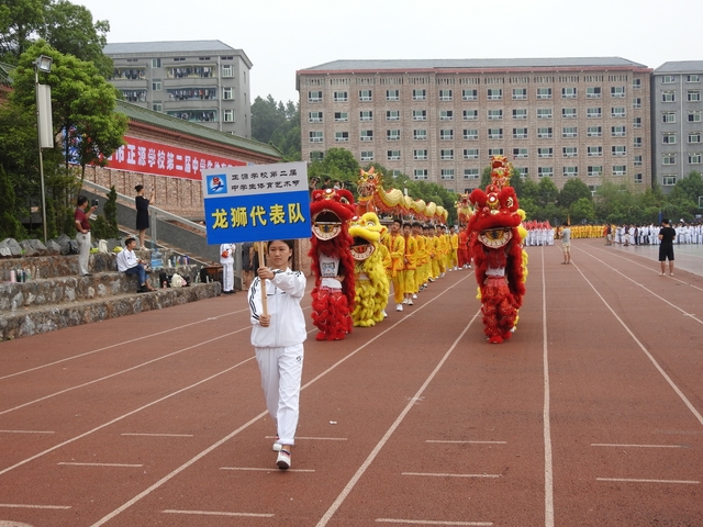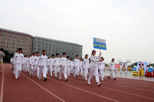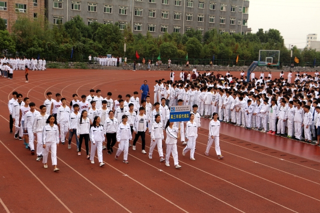 《歌唱祖国》的音乐旋律慷慨激昂,武警军人着装、俨然天安门国旗班战士的国旗方阵首先入场,英姿勃发,器宇轩昂。校旗方阵、节徽方阵、“发展体育运动 增强人民体质”标语方阵、龙狮方阵、彩旗方阵、武术方阵、初中教师太极拳方阵、裁判员方阵,以及从高三降次到准初一的各年级代表队方阵,依次从主席台面前走过,队形整齐,步履铿锵。