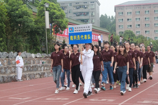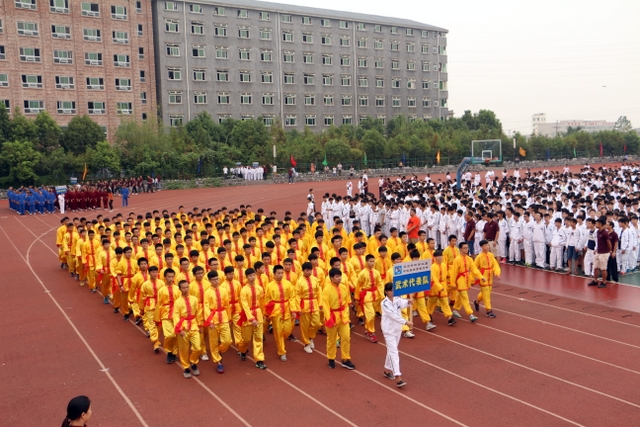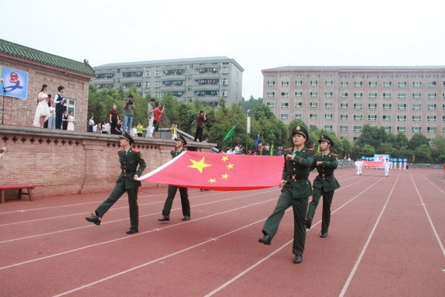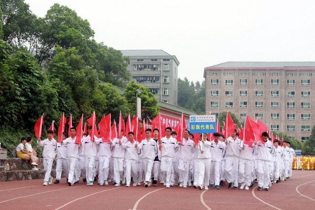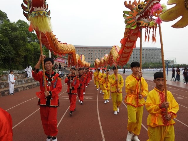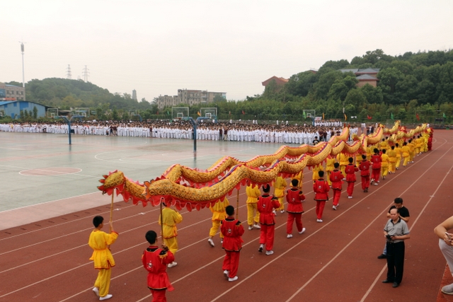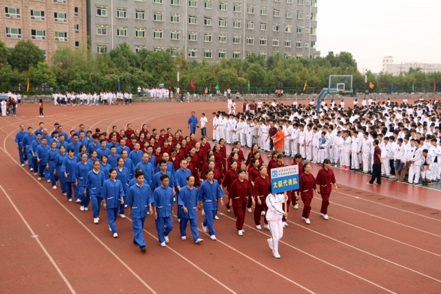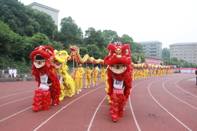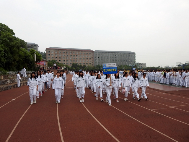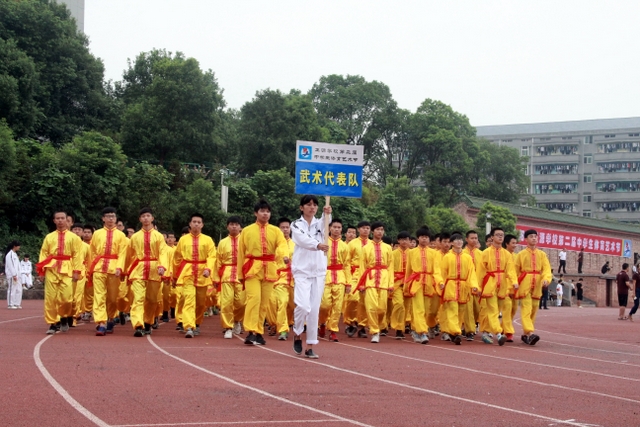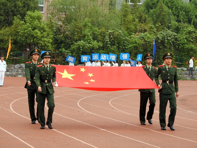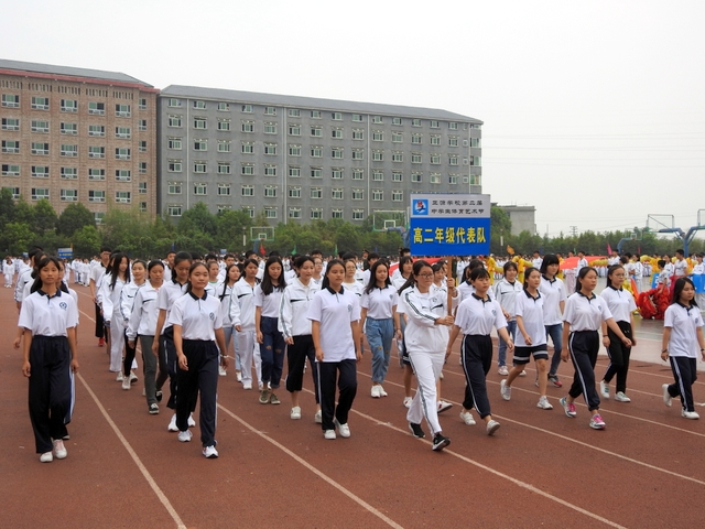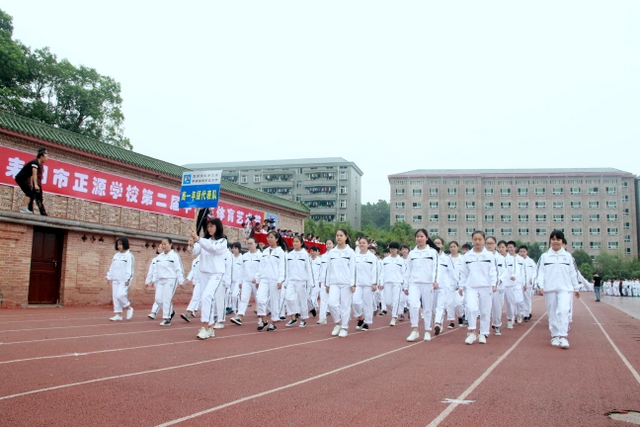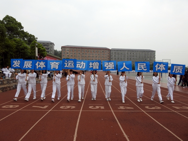 《歌唱祖国》的音乐旋律慷慨激昂,武警军人着装、俨然天安门国旗班战士的国旗方阵首先入场,英姿勃发,器宇轩昂。校旗方阵、节徽方阵、“发展体育运动 增强人民体质”标语方阵、龙狮方阵、彩旗方阵、武术方阵、初中教师太极拳方阵、裁判员方阵,以及从高三降次到准初一的各年级代表队方阵,依次从主席台面前走过,队形整齐,步履铿锵。