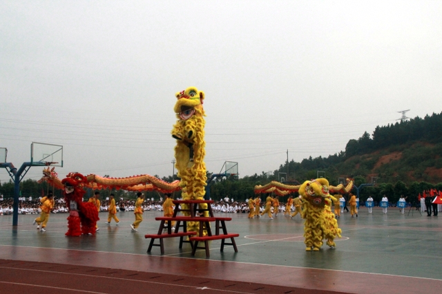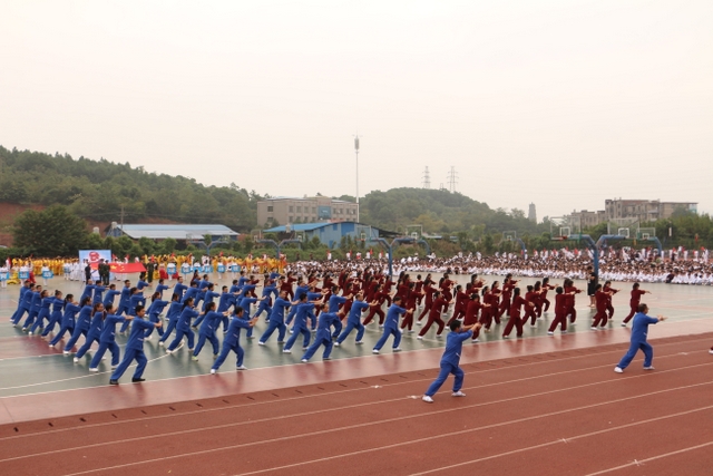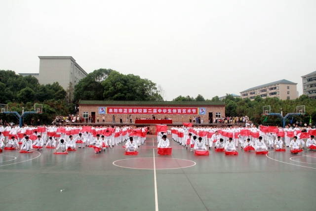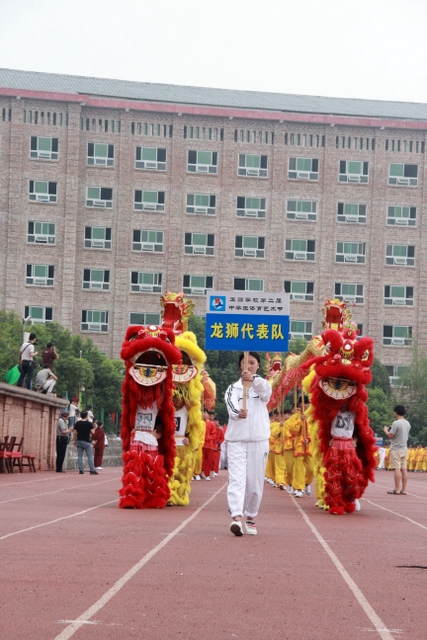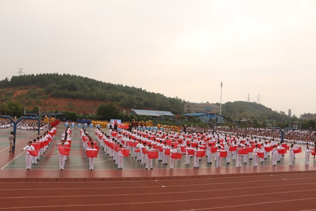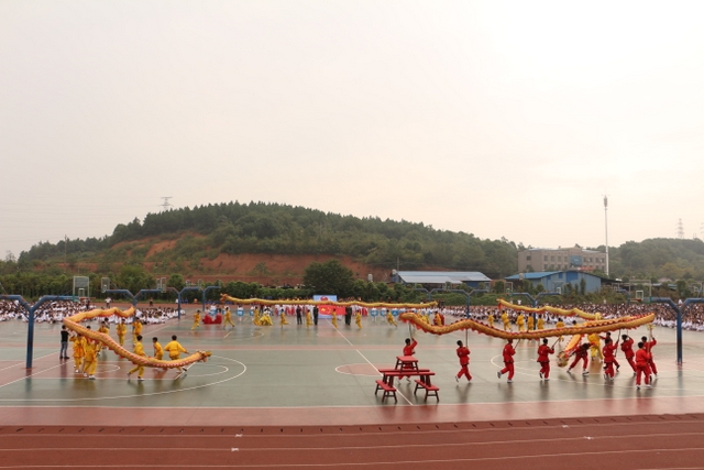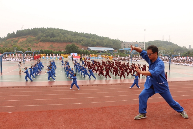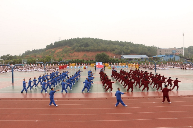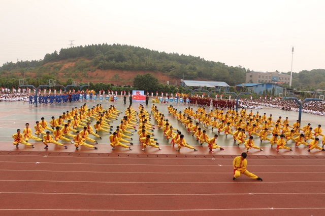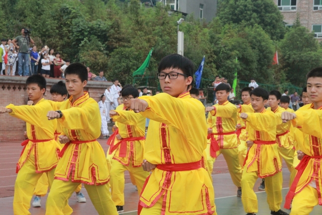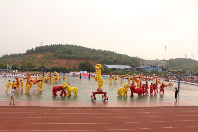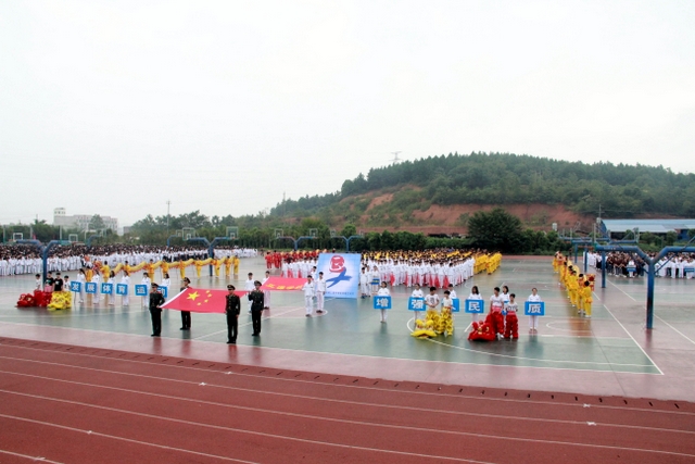 一百多名高一同学表演了彩旗舞。高二同学尽管学习非常紧张,他们表演的武术让人刮目相看。白鹤亮翅、并部对拳、弓步冲拳、弹踢冲拳、提膝勾手、大越步前穿、转身弓步劈掌、转身拍地……一招一式,刚劲有力;一吼一啸,气贯长虹。