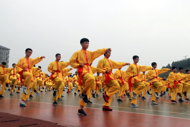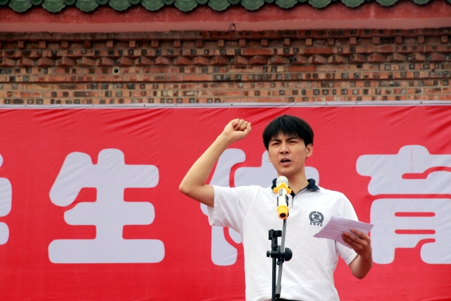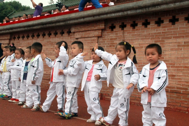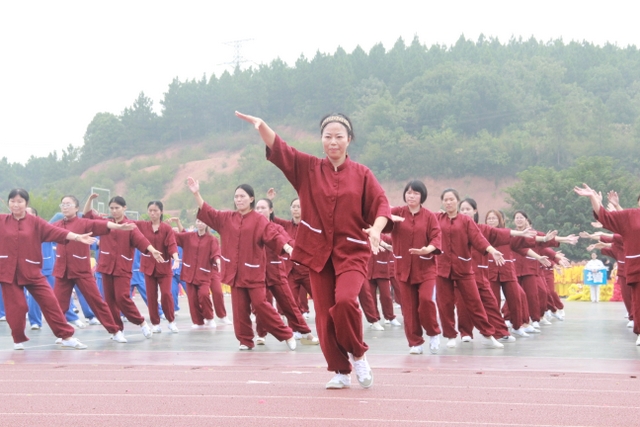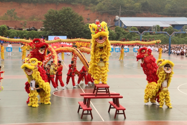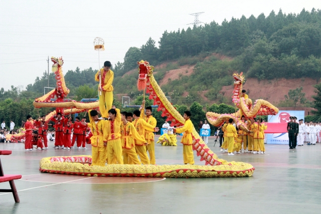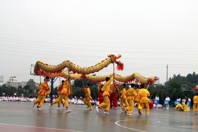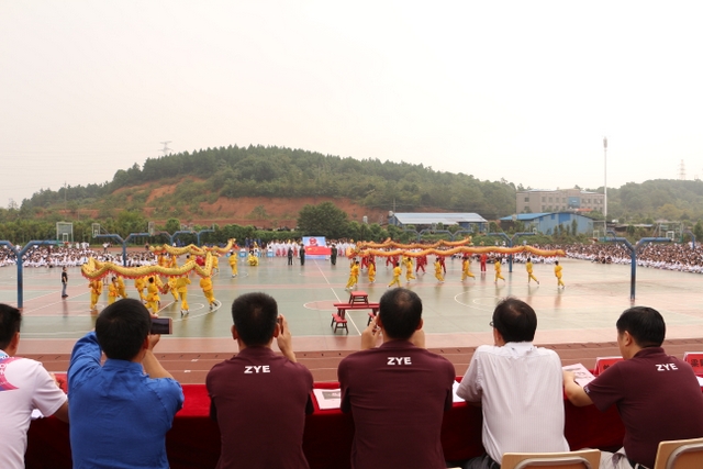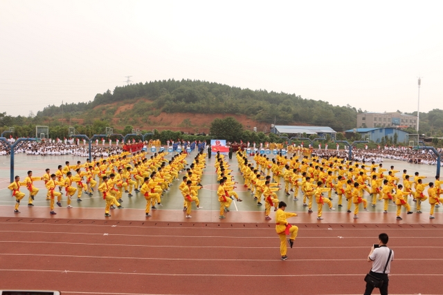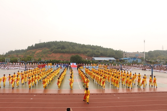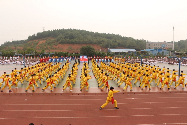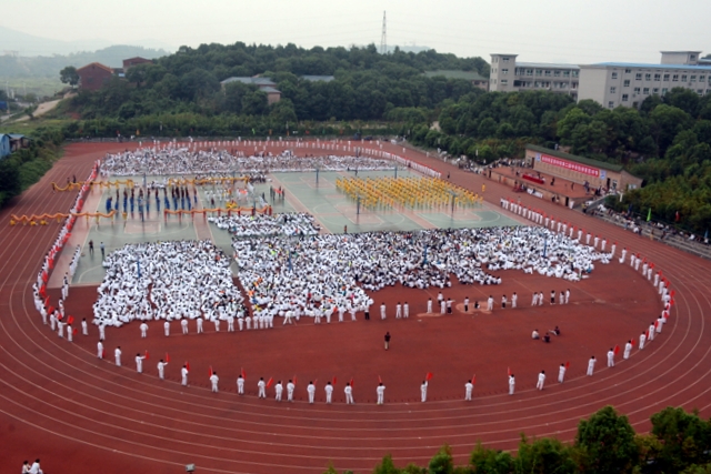 一百多名高一同学表演了彩旗舞。高二同学尽管学习非常紧张,他们表演的武术让人刮目相看。白鹤亮翅、并部对拳、弓步冲拳、弹踢冲拳、提膝勾手、大越步前穿、转身弓步劈掌、转身拍地……一招一式,刚劲有力;一吼一啸,气贯长虹。