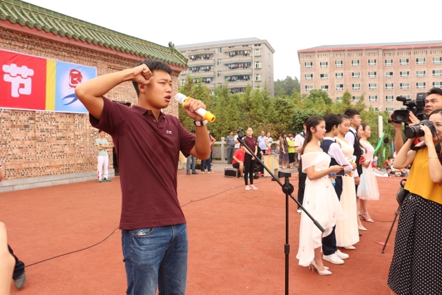 跑操完毕,主持人李濠丽、蔡俊洋、潘美亚、罗彩霞、陆豪、黄飞六位同学闪亮登场,体育艺术节入场式帷幕拉开。