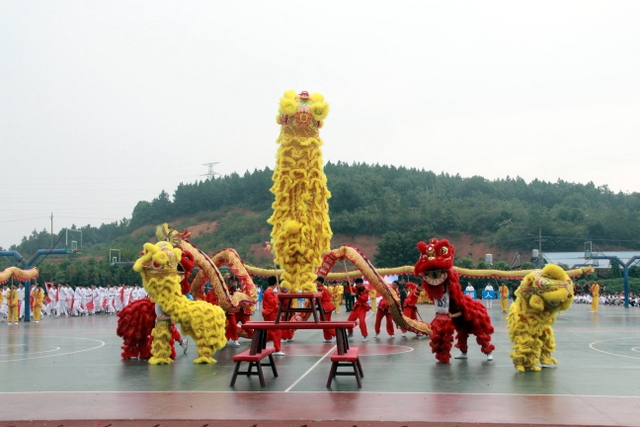 接下来的团体表演,美轮美奂,精彩绝伦,充分体现出普及性和群众性。龙狮表演依然是正源的传统好戏。四条金龙,五头雄狮,威风凛凛,气势夺人。看金龙,时而快速奔进,时而搭起龙门,时而舞出“八”字,时而舞成龙“舟”,还有仰地舞,翘首舞,多姿多彩,目不暇接。看雄狮,穿行金龙之间,相得益彰,而又独具风采,引人入胜。有时直立,如瞭望的哨兵;间或戏闹,似顽皮的小猴。翻转腾挪身矫健,顾盼生姿影精神。
