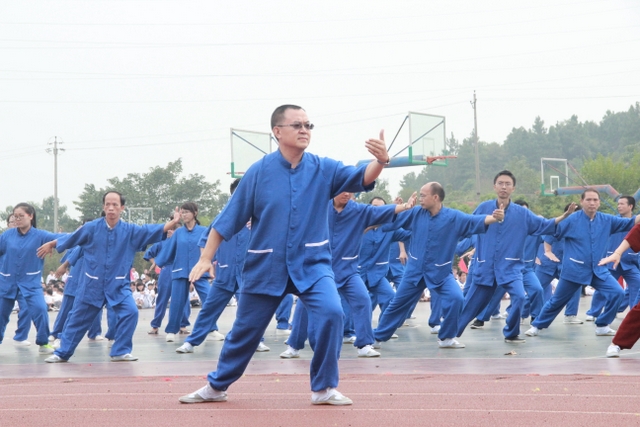 110名初中部老师表演的太极拳别有一番风采。二十四式太极拳音乐轻慢舒缓,婉转悠扬,老师们轻舒双臂,款扭身腰,缓移脚步,如春风拂柳,似荇叶随波。