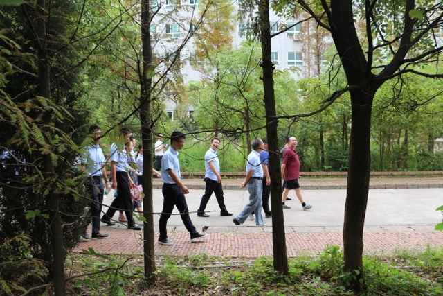 罗校长引导客人一面参观校园,一面介绍学校的风水特点、建筑特点等。“我们东苑的这一建筑是依中山大学社会学系的原建筑参考而建,就靠着一张照片建立起来的。”客人们边听边看边问,一路走来,对学校宽阔舒展的校园面积、顺其自然的自然环境、恢弘大气的结构布局、新颖别致的建筑艺术、匠心独运的风景点缀赞赏有加。