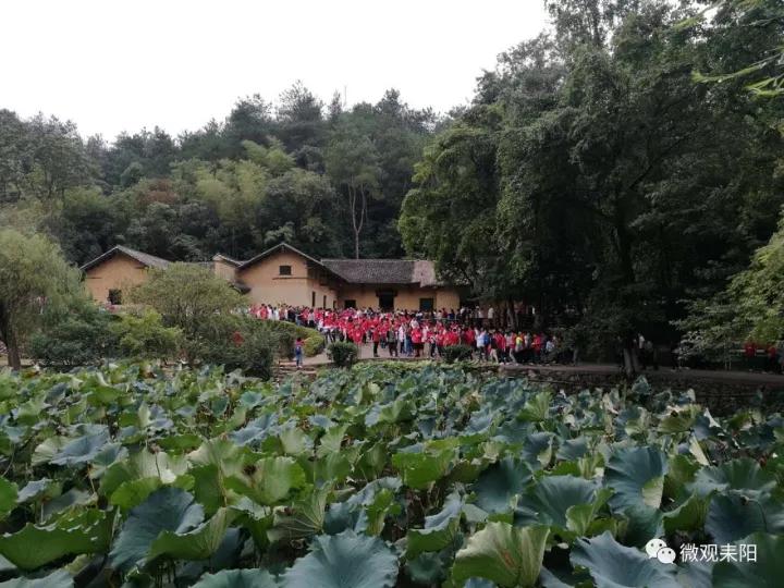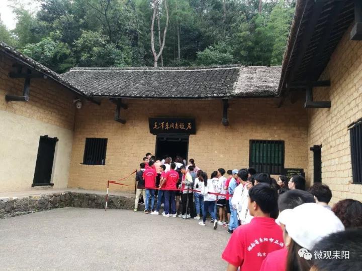 在游客中心换乘旅游车进冲,同学们首先参观毛主席故居。一栋泥砖青瓦、土结木构的农家屋舍,前面是荷塘,左边是菜地,右边是稻田和晒谷场,背面是长满松竹的后山,这就是毛主席故居,一个很普通的山冲人家。