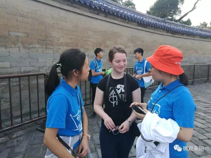 一路上,同学们和外国游客用英语交流,锻炼自己的胆量和口语水平。1704班蒋彤和一个澳大利亚小女生聊得最欢,还合影留言。在回音壁,同学们分队站在东西两头,呼喊口号验证回音的效果。在圜丘,同学们围成一个同心圆,为祝福祖国而歌。