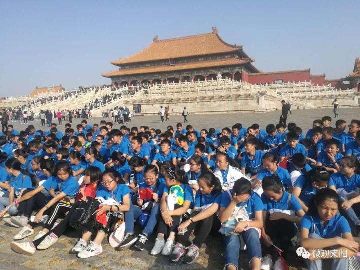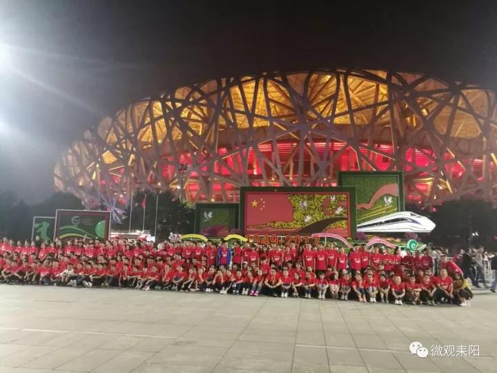 从长城下来,来到北京奥林匹克公园。华灯初上,水立方像一个巨大的灯笼,在夜幕下显得灿烂辉煌。同学们在这个大灯笼下,列队集合,听校长讲话,唱歌留影,表达爱国之情。在这里游玩的一对耒阳夫妇,意外看到家乡的学生在鸟巢前面的风采展示,感到很自豪,觉得为耒阳人长了志气。