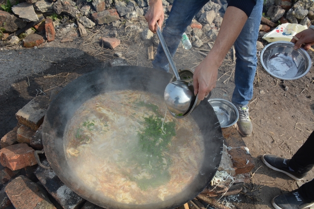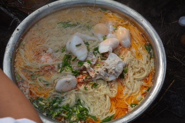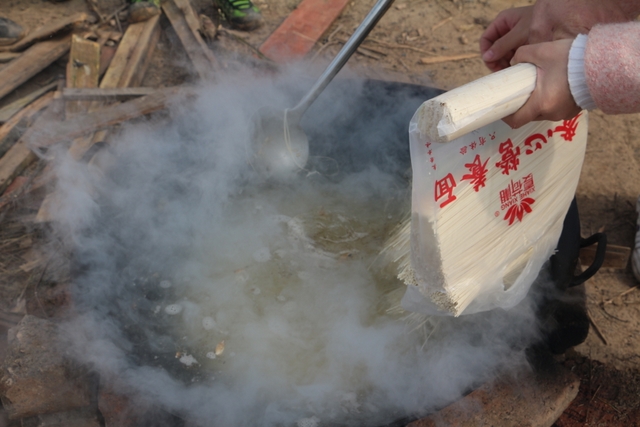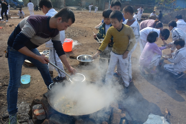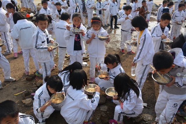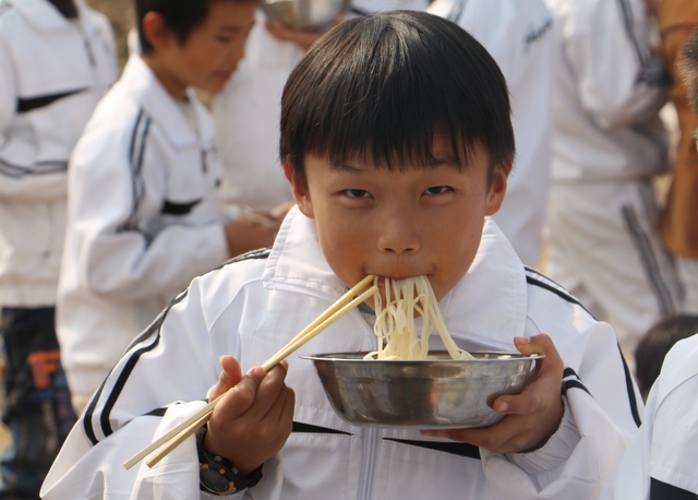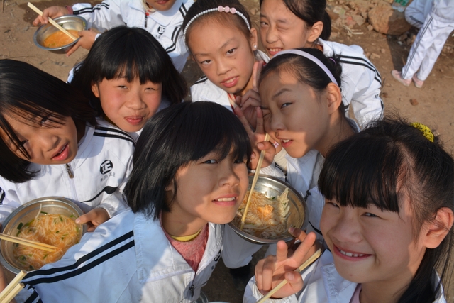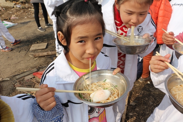 半个小时后,飘来了一阵阵面条的香味,孩子们捧着一碗碗的面条,脸上洋溢着幸福的笑容。有的孩子嘴里还不断地发出赞叹声“好吃!好吃!真好吃!”