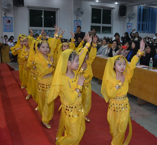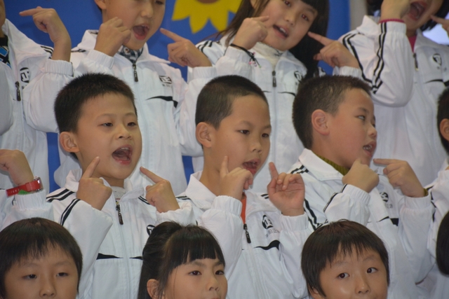 女孩们用轻盈优美的舞姿为我们开场。晚上6:50, 282班带来的《花仙子之歌》拉开了大赛的序幕。287班《感恩的心》将全场气氛激发到最高点。同学们报以雷鸣般的掌声。《七色光之歌》、《明天会更好》、《种太阳》……一首首熟悉的歌曲在孩子们的精彩演绎下焕发新的光彩,嘹亮的歌声,优美的动作,使孩子们在歌声中感受到了艺术的魅力。