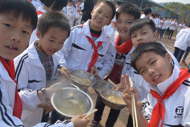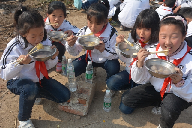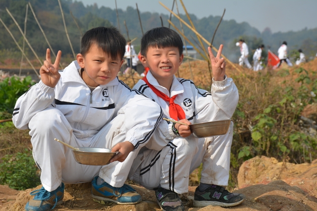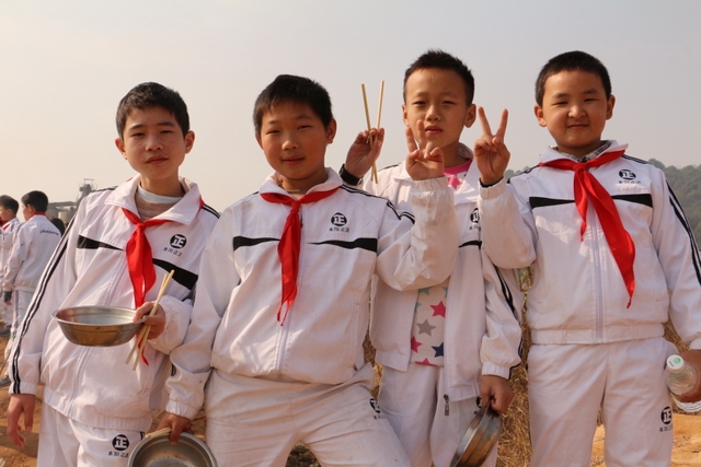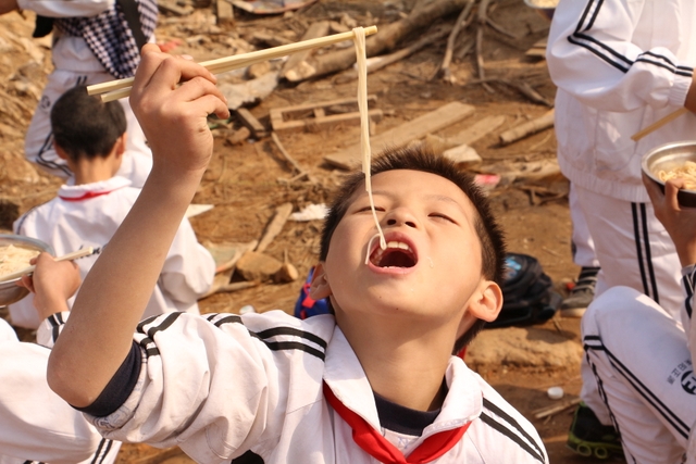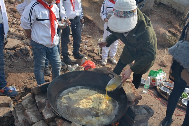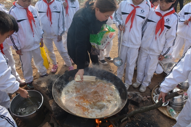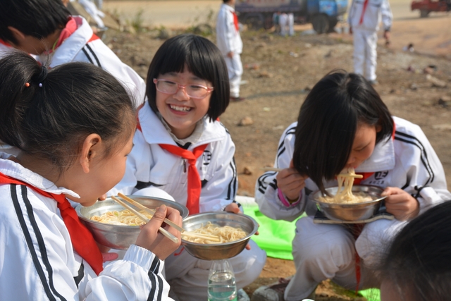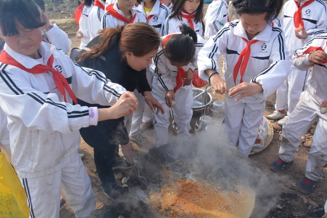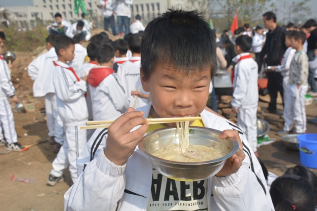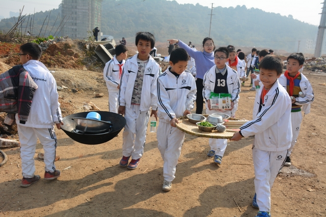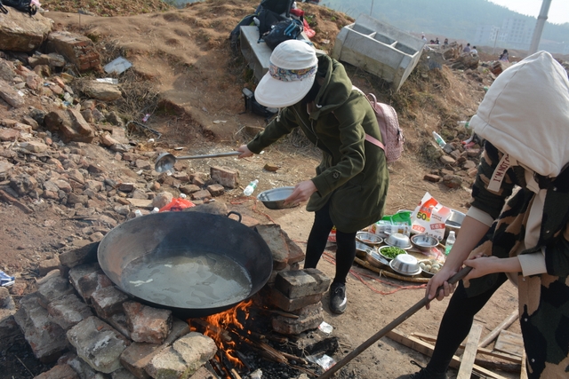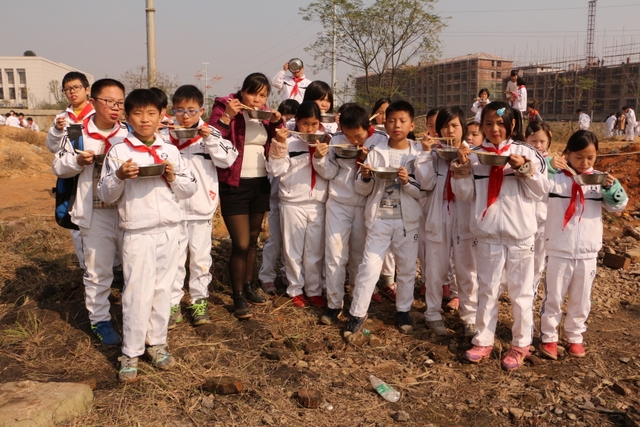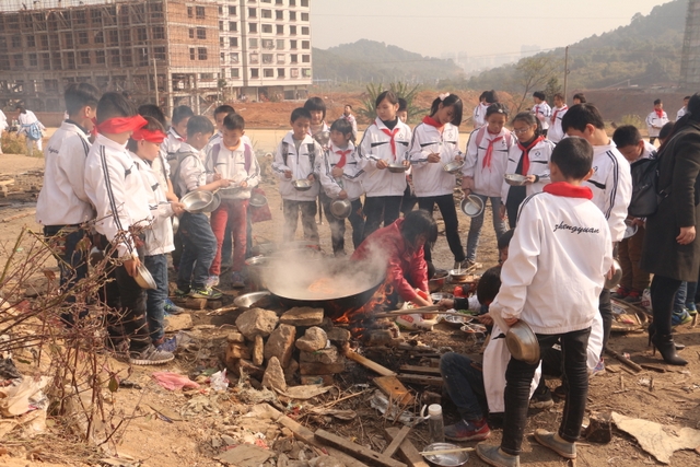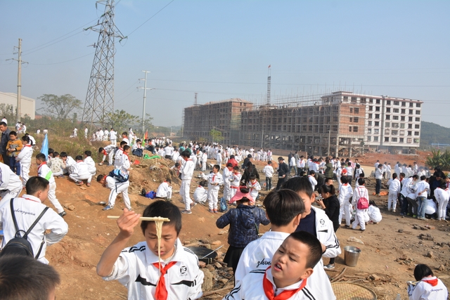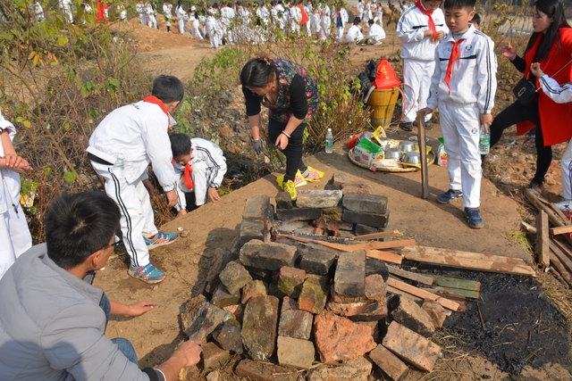 8时许,随着年级主任王巧云一声令下“出发!”,一条白色的长龙从学校西门逶迤游开了。一路笑语一路歌哟,九百朵鲜花在阳光的映照下争奇斗艳,各炫风姿;九百只雏鹰在蓝天上展翅翱翔,竞显羽翼。不知不觉间,冬游的第一站到了——耒阳市人民法院后侧的南岭山山脚。师生们要在这里埋锅造饭,席地野炊。学生们忙开了,老师们也忙开了,有的架锅,有的生火,有的捡柴,有的提水,袅袅炊烟伴随着阵阵清香,学生们自己煮的面条熟了。品尝自己劳动的佳肴,师生们大快朵颐,好不欢畅!