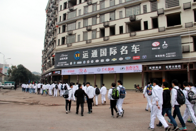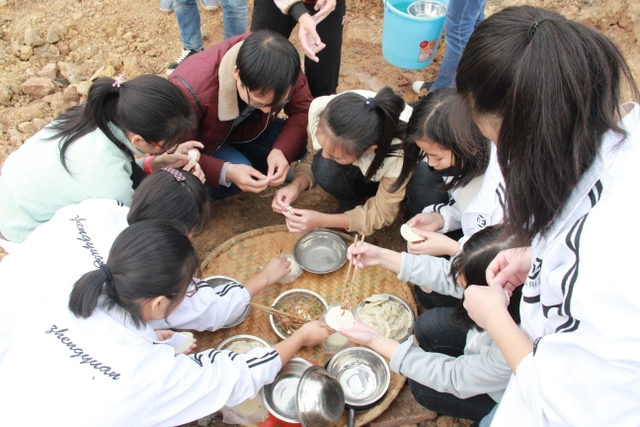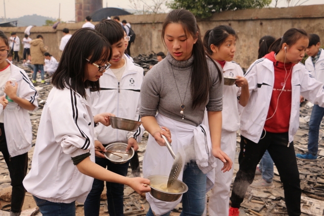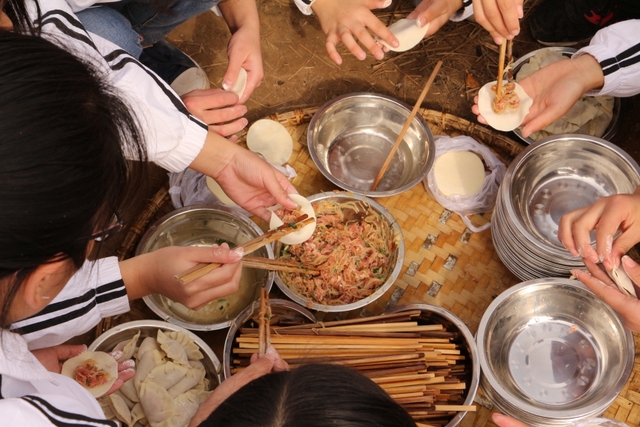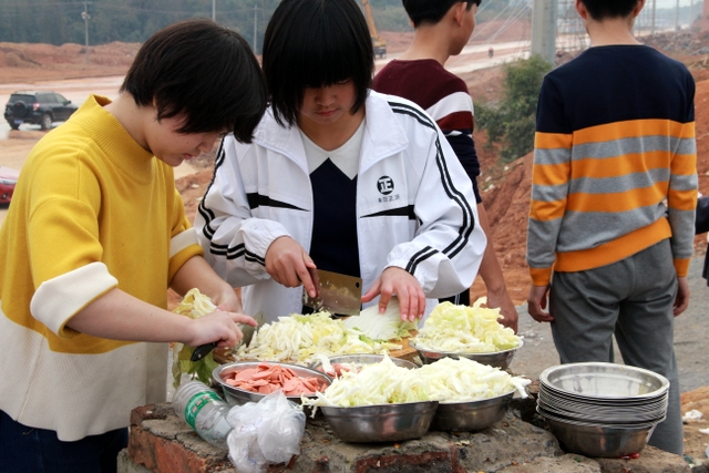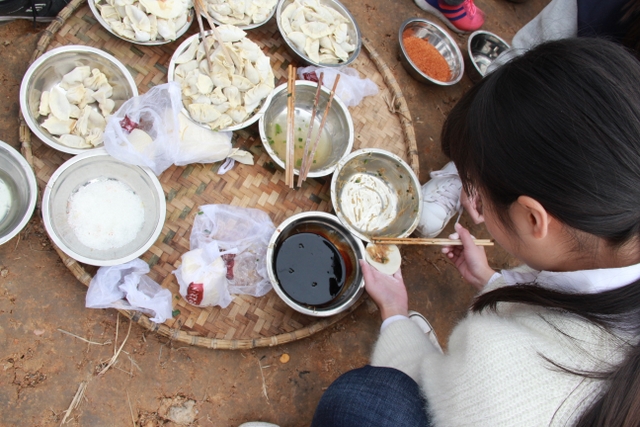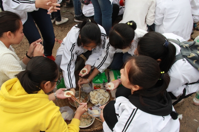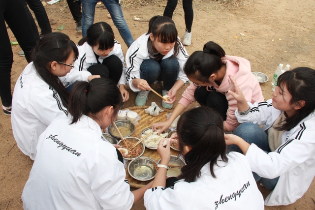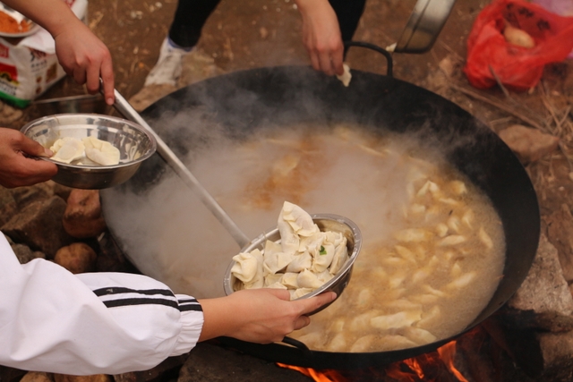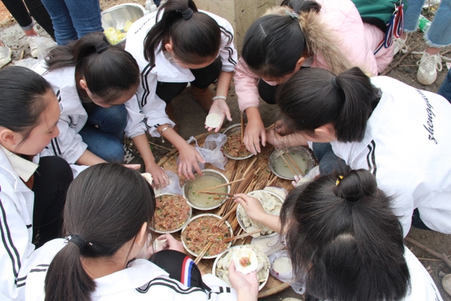 他们用手托着一块面皮,用勺子将肉馅送了上去,调节一下份量,再将肉馅稍微收紧一些,然后将面皮一对掐,一个饱满的饺子就出来了。虽然还未煮,可为什么那饺子却仍然散放着诱人的香味?看的我嘴馋,不行,不能怂,忍住。一个个饺子开始在他们灵活的手下不断的诞生,过了许久,才包完了够全部人的分量。看他们弯腿的样子,就可以知道他们应该也挺累,毕竟刚走完那么远的路,还要蹲那么久,准又会不累呢?但他们从未抱怨,只是默默奉献自己的力量,让我们为我们的女同学点个赞吧!