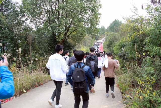 满足的享受完这场盛宴之后。我们又精力满满地上路了。大家回味着刚下肚的美味。怀着对目的地的希望,在路上欢声笑语,步履轻快。漂到顺湖的入口时,我们欢呼着一个个都撒开腿跑着,钻进顺湖的怀抱里。稍做整息后,我们就要到场地集合了。走过水上长长的回廊,湖面波澜不兴,像一个包容万象的长者在无言地表达对我们到来的欢迎。回廊的椅子上坐着一位老人。他正拿着麦克风,旁若无人地歌唱。有人短暂驻足。一曲唱罢,他们大力的鼓掌,同学们发出善意的笑声,老人也略微得意地笑,像在说:“我唱的好吧!”继续向前行,旁边是一片荷花池,现在是冬季,她们已经凋零了。但到了夏季,我相信她们一定会开得非常繁盛美丽,不遗余力地舒展着自己的腰肢,游客们便流连忘返,赞不绝口。