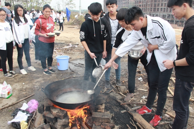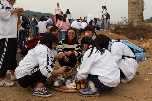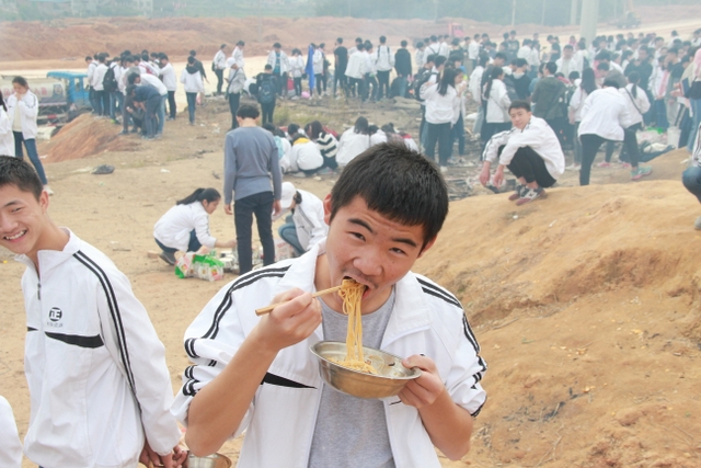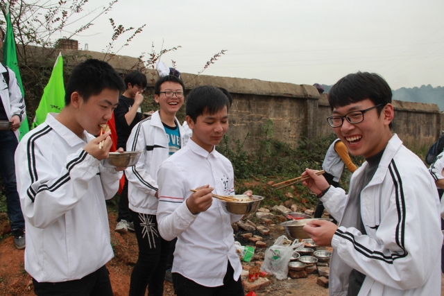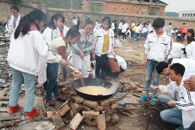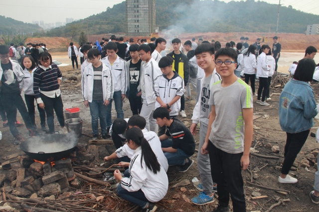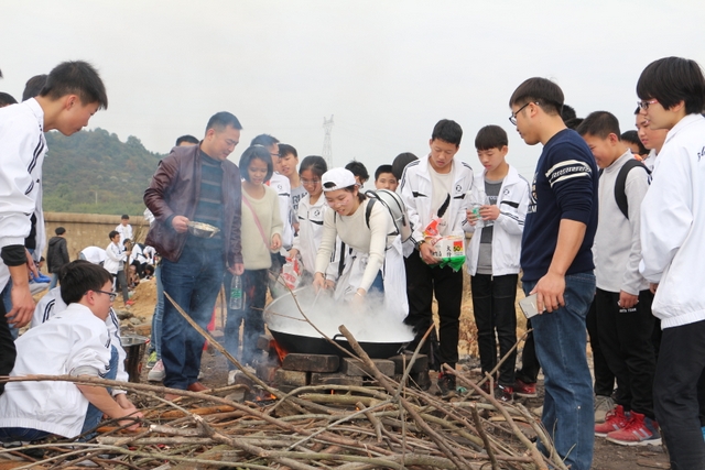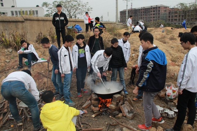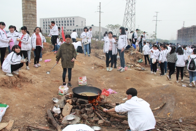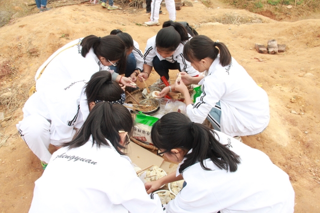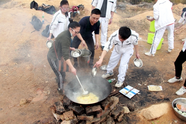 这次什么意外也没有,没有什么可提的,只是不愿放下工作罢了,回来时柴已经够了。好!“大功告成”!便静静待在一边,不再去做什么了。火在熊熊烧着,像是火的精灵般,在空气中自由自在地舞动着,周围的空气也随之舞动,这火的炫丽从何处来?我静静地盯着跳动的火精灵,“空气,空气,空气……还有柴!”是我的柴让它舞动起来的,是我朴质而又平凡的柴使他绚丽起来。火的精灵在我的心中飞舞着,点亮点点星光。时间如风一般,一去便也不归。水沸了,面下了,熟了,菜炒了,是该吃点东西了,我排着队去领面吃。在同学们一位接着一位吃面的时间里,有的同学接到面后大口吞咽,露出满足的笑脸,有的先抢到面的同学在还未抢到面的同学故意装作很香的样子,有的同学吃得太爽时大叫,“这好吃!”。不过能找到一个词来形容——开心。那样的愉悦,那样的快乐,仿佛也会传染似的,逐渐填补了我的心,是什么产生了快乐,我想,是火,呵!并没有多想什么了,我随意找了一处土丘,蹲着吃上面,陶醉在幸福之中。