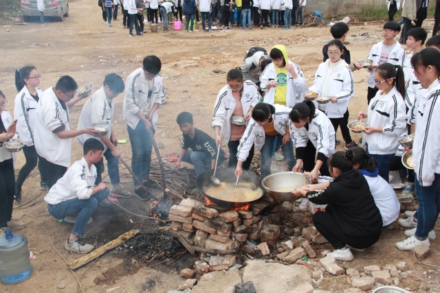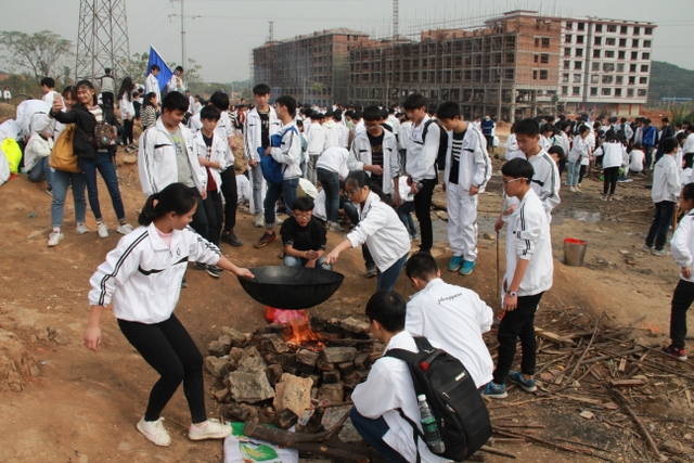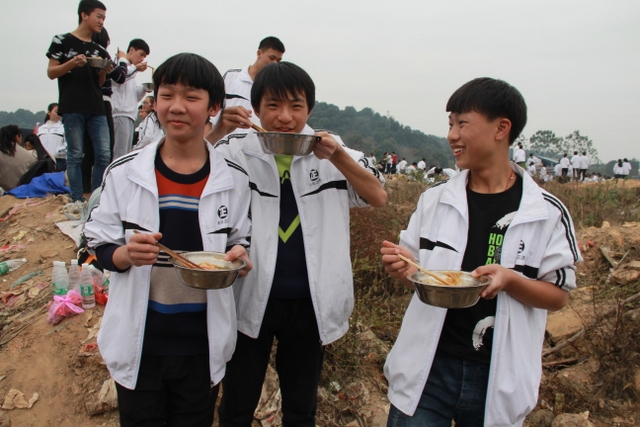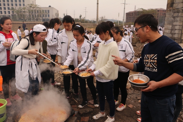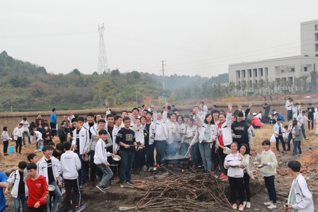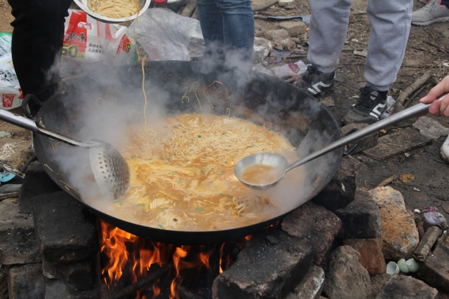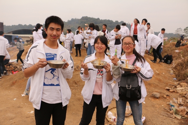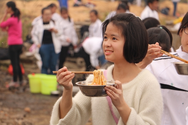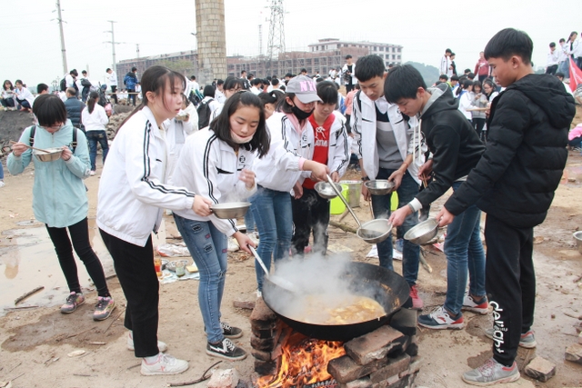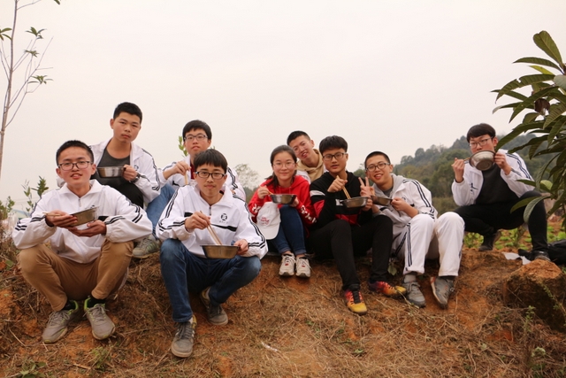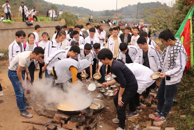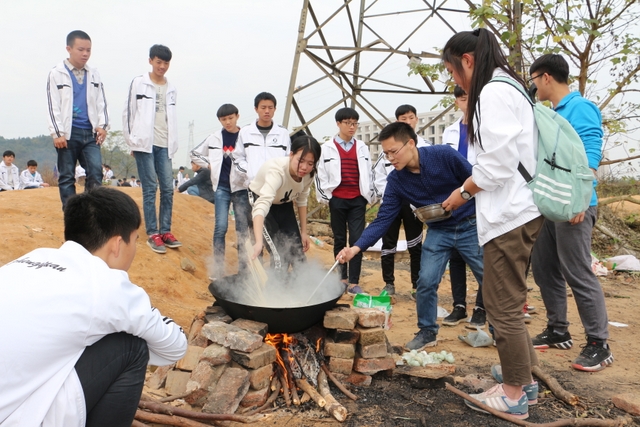 这次什么意外也没有,没有什么可提的,只是不愿放下工作罢了,回来时柴已经够了。好!“大功告成”!便静静待在一边,不再去做什么了。火在熊熊烧着,像是火的精灵般,在空气中自由自在地舞动着,周围的空气也随之舞动,这火的炫丽从何处来?我静静地盯着跳动的火精灵,“空气,空气,空气……还有柴!”是我的柴让它舞动起来的,是我朴质而又平凡的柴使他绚丽起来。火的精灵在我的心中飞舞着,点亮点点星光。时间如风一般,一去便也不归。水沸了,面下了,熟了,菜炒了,是该吃点东西了,我排着队去领面吃。在同学们一位接着一位吃面的时间里,有的同学接到面后大口吞咽,露出满足的笑脸,有的先抢到面的同学在还未抢到面的同学故意装作很香的样子,有的同学吃得太爽时大叫,“这好吃!”。不过能找到一个词来形容——开心。那样的愉悦,那样的快乐,仿佛也会传染似的,逐渐填补了我的心,是什么产生了快乐,我想,是火,呵!并没有多想什么了,我随意找了一处土丘,蹲着吃上面,陶醉在幸福之中。