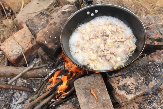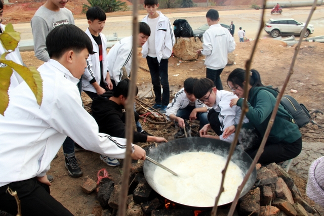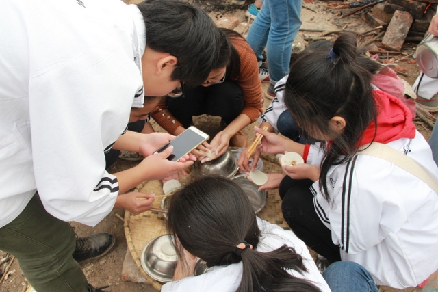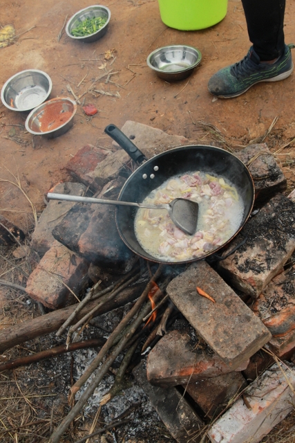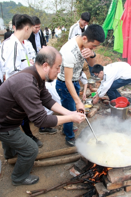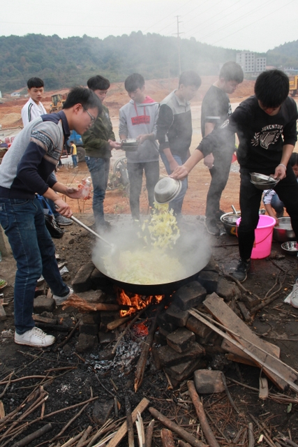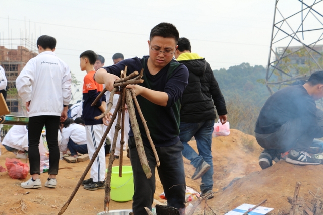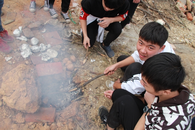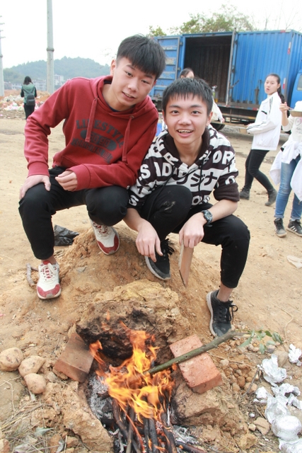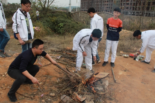 灶有了,现在就该生火了,想一想,大冬天围在火炉旁,也许是一件不错的享受吧。我们先用一些细小的树枝,在灶台一纵一横的搭起了一个网状的火柴架,并在下方塞满了干草。自信满满的我们兴奋地从袋子里掏出高新产品打火机。这种条件古代可是没法享受到的,所以他们就只好钻木取火了。我们俯下身,一手扶着灶台,一手伸入柴棍下点火,不料干草并未干透,冒出来的一股浓烟直冲到我们下面,熏得我们眼泪纵横,现在回想起来,眼睛仿佛还有点胀痛。之后,我们便改用了纸来引火,这样既不会伤害到自己,又容易引燃,可谓一举两得。火被引燃了,只要适当地添柴控制,火不熄灭即可。不过那看火的同学就难受了,蹲在灶火旁,一边接受浓烟的熏淘,一边接受烈火炙烤,虽然是大冬天,可这样的遭遇还是令人同情!小火工加油,我们的精神与你同在。