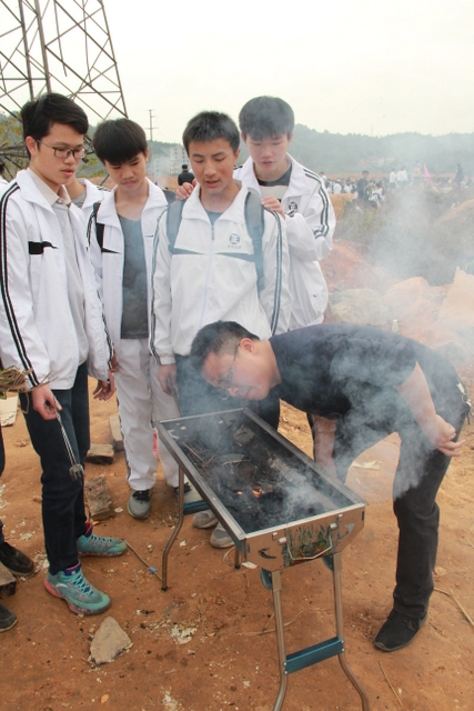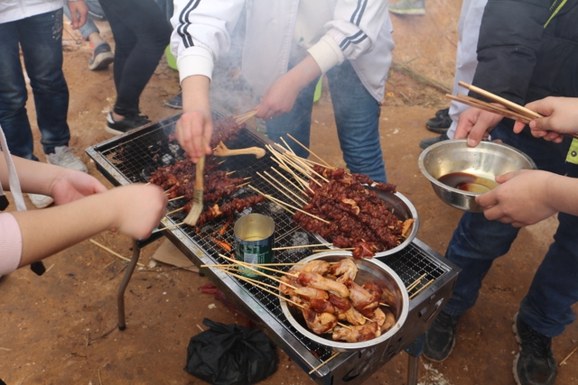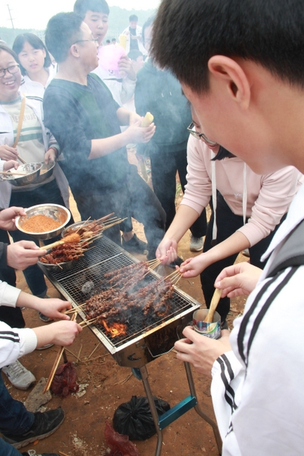 这次的野炊可有些与众不同,因为我们还多了烧烤。拿出我们带的烧烤架,简单的组装,再放入木炭,烧烤准备就绪。因为大家都是第一次烧烤,没有经验,那木炭迟迟没有点燃,有的只是那一缕将要消散的炊烟。这时,肖老师来助阵,“加木炭、倒油、点火,然后扇风。”,就这样烟慢慢的多了,火也有了苗头,大家欢呼雀跃,都为老师点赞。到木炭通红之时,也就是烧烤真正开始之时。在我们点木炭的时候,有的同学们就已经开始了准备工作,用事先准备好的木签去串烧肉、香肠、鸡腿、韭菜和茄子。