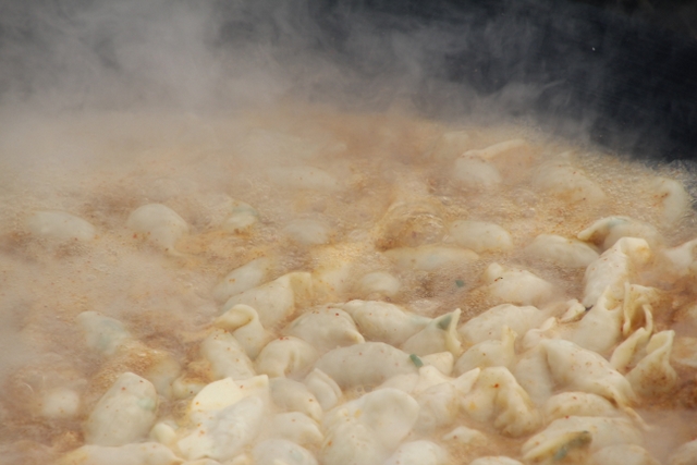 在同学们紧迫地有序地解决了面条以后,我们便开始煮饺子了。我们将饺子小心地放入锅里,Miss Xie则拿着勺在摆弄这些饺子。起初这些饺子们还静静地伏在锅底,隔着水仰视着我们。过一段时间后,他们便开始沸腾了,一个个的在锅里翻来覆去,似鱼儿戏水,又仿佛海鸥在阵阵海浪中穿翔,好不热闹。不知为何总觉这一幕似曾相识,小时候,和妈妈一起煮饺子的时候,不就是这样的吗?只是那时的我只会眼巴巴地看着锅,小手不断地扯着妈妈的衣角,央求她赶快帮我盛一碗,而现在的我都已经可以独立参加野炊,转眼便是匆匆十年。晶莹的饺子在碗里闪着亮光,夹起一个送入嘴里,轻轻咬破,味美的汤汁充盈了自己的嘴,带来的不止是味美,还有儿时的回忆吧!