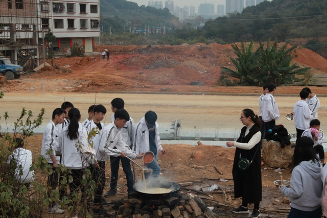 呼——终于到了。映入眼帘的是一片堆有小土丘的高低起伏的废弃的场地。而这里也是我们将要野炊的地方。野炊呢,可是我们这次都有的一个极其重要的组成部分。既然要野炊,那必然要生火,既然要生火,那搭灶也在所难免了。不过,可千万不要小看了这件事,搭灶也是要有技术要求的,要不然可就要像我们上回春游一样,面还没煮完,灶就垮塌了,那就是悲剧了。因为在我们这个年级去之前,学校已经组织了几次,其他年级的冬游野炊,地点相同,有一部分灶台保留了下来,但在吸取上次经验的基础上,我们决定用捡来的砖在灶台的侧旁进行加固,在灶台的后方弄得较稀疏一些,留有缝隙换气。忙了一阵后才搞定。嗯!灶台够结实,不过因为多穿了件外衣的缘故倒显得有些“胖”了,哎算了,反正不要紧,谁让我们是实用主义崇拜者呢?