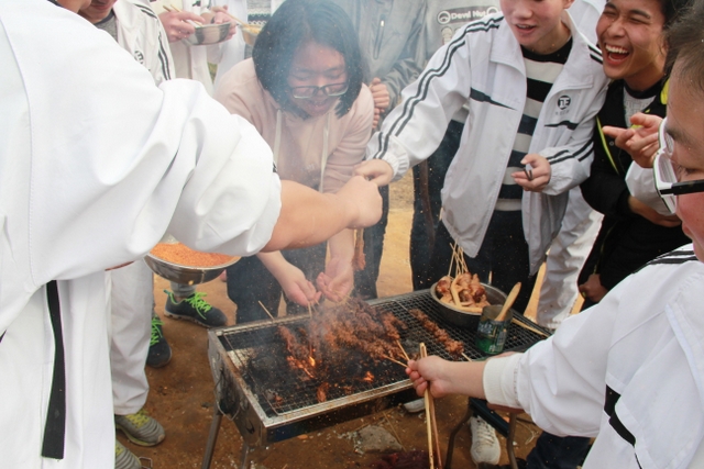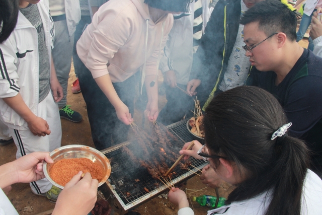 在烤的时候,大家都分配好了任务,有烤肉的、刷油的、涂辣椒的和调控火候的,虽说都有了明确的分工,但因为经验不足,都手忙脚乱的。这时,我们的大救星肖老师又来了,指挥我们工作。这又如给我们吃了一颗定心丸,突然都变得井然有序,同学不断地给肉刷油,眼睛被烟熏得都快睁不开了。涂辣椒的同学变成了撒辣椒的,一手撒一大把辣椒,漫天飞扬,那时同学们都纷纷闭上眼睛,只听得肖老师大声叫道:“好好刷油,加孜然,太香了,就这种感觉。”真的,实在是太香了,旁边的同学早已按捺不住了,看着那一串串将要出炉的肉串,都露出了一副垂涎欲滴的样子,甚至连老师们也都闻香而来。终于,我们的第一批烤肉出炉,大家争先恐后的抢着吃肉串,不论是同学还是老师,吃过之后,无一不拍手称赞,满脸尽是享受。