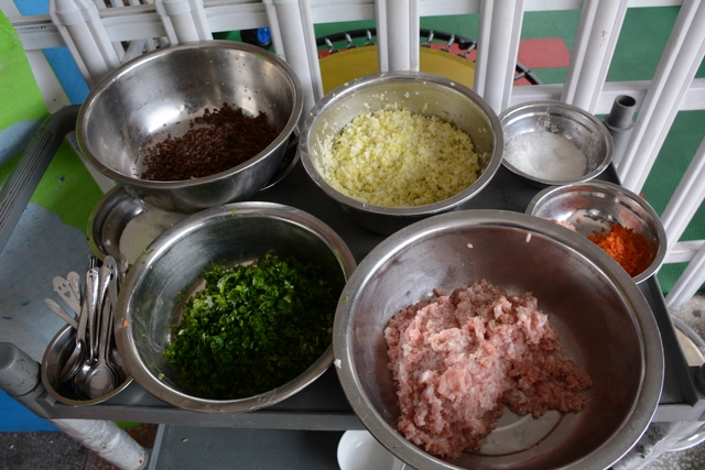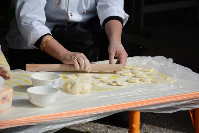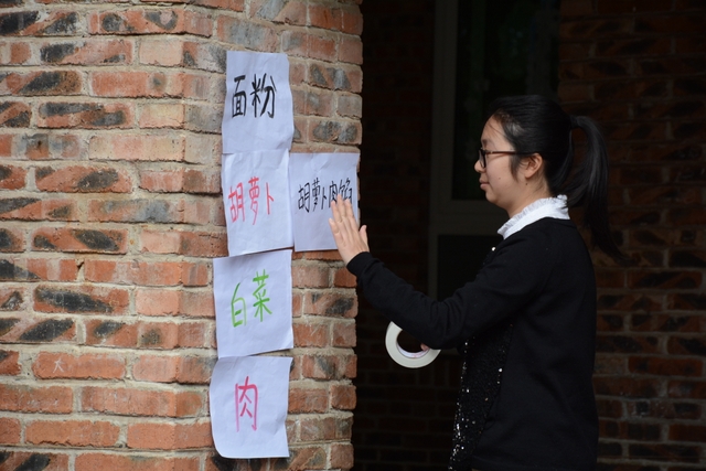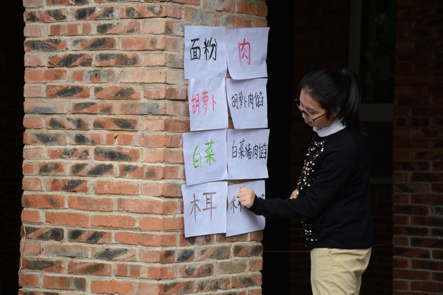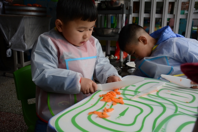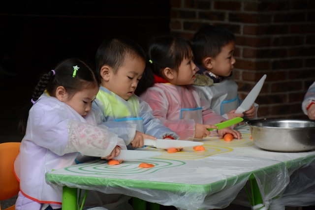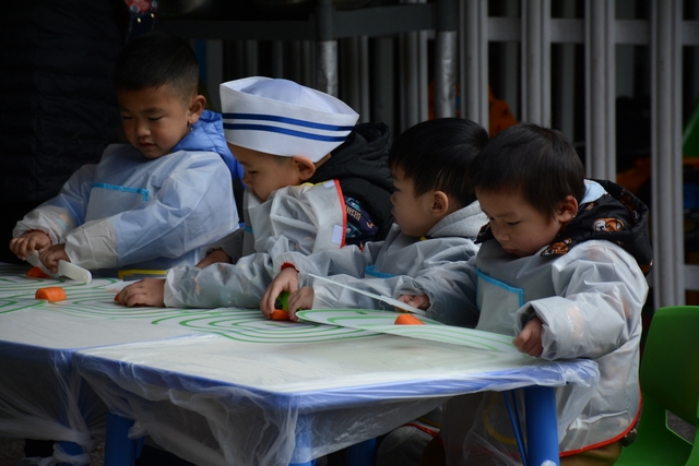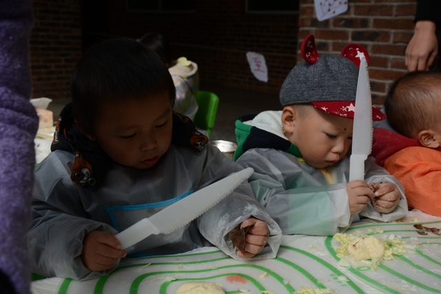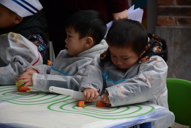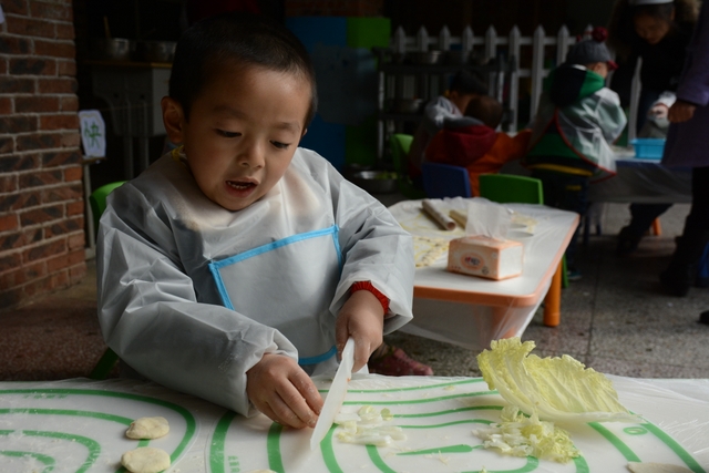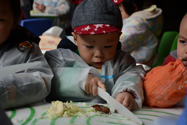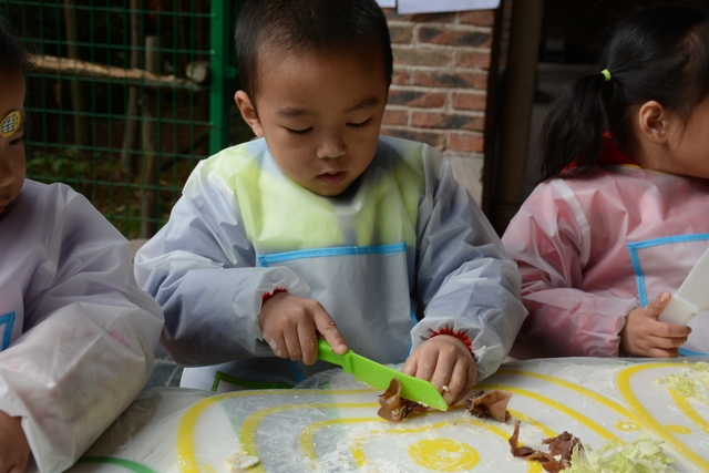 小朋友们自己和面,给面粉加水、揉成面团、擀面皮;切菜,切胡萝卜、白菜、木耳;包饺子,用几种馅料包饺子,小小的手却也能包得有模有样。