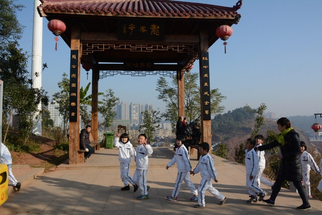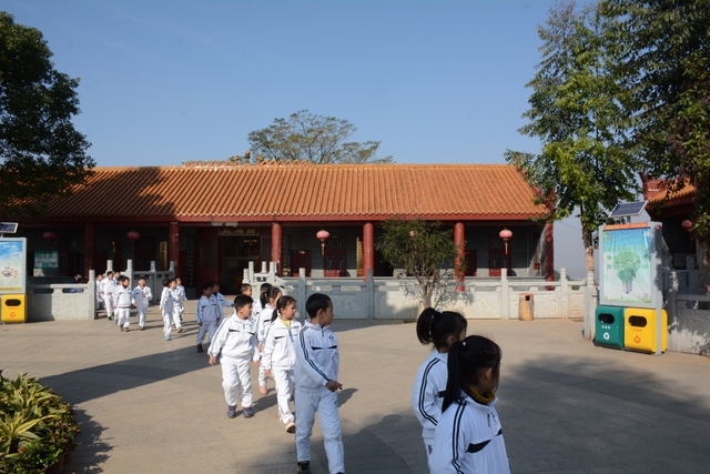 10点20分,大家再次整队集合,朝公园的最高点——普贤寺——进发。到达山顶,天地一片开阔,顿觉神清气朗。孩子们深吸一口气,来到寺外广场。广场上有一尊高僧打坐的“塑像”,闭目合十,宝相庄严。调皮的孩子们涌上前,学着手势道阿弥陀佛,谁知“塑像”竟微微一笑睁了眼。原来不是塑像,真是打坐清修的僧人。孩子们且惊且喜,笑得天真烂漫,真可谓冬日游宝地,童子遇禅机。