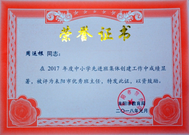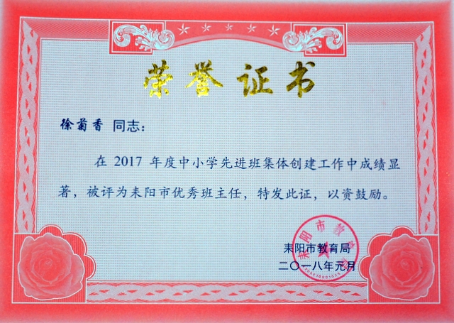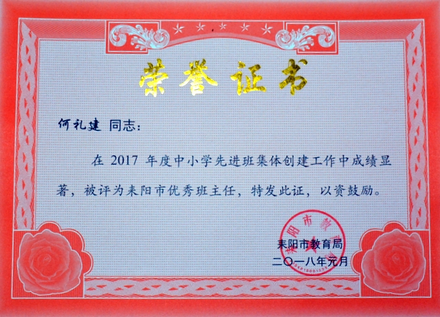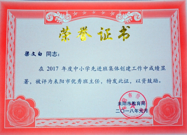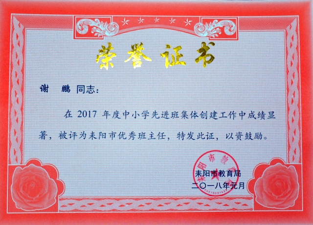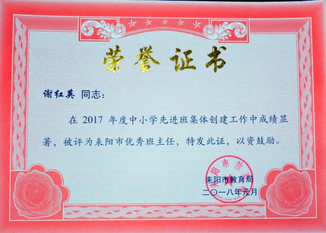 根据《关于评选中小学先进班集体和养成教育示范学校的通知》(耒教通〔2017〕123号)精神,我校各年级认真组织,积极开展创建活动,取得了良好成效。经各年级申报、推荐,学部考评,学校上报教育局审核、考评批准,小学部四年级216班、五年级184班、六年级270班,初中部准初一354班,初一年级323班、315班,初二299班、297班等8个班荣获“2017年度耒阳市普通中小学先进班集体”荣誉称号,谢红英、周运根、梁文白、贺娟、徐菊香、黄志翔、谢鹏、何礼建等8位老师荣获“耒阳市优秀班主任”荣誉称号。