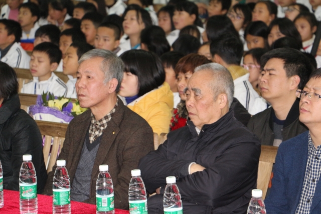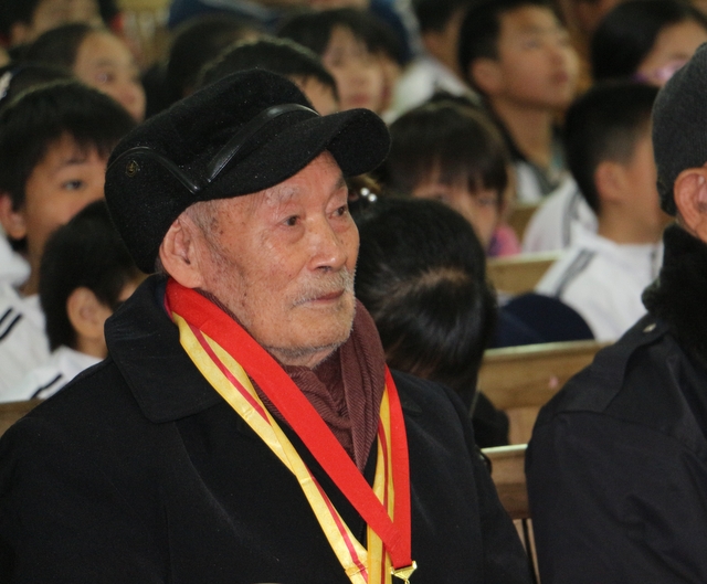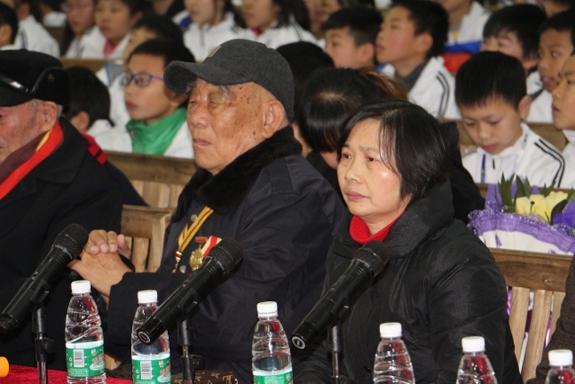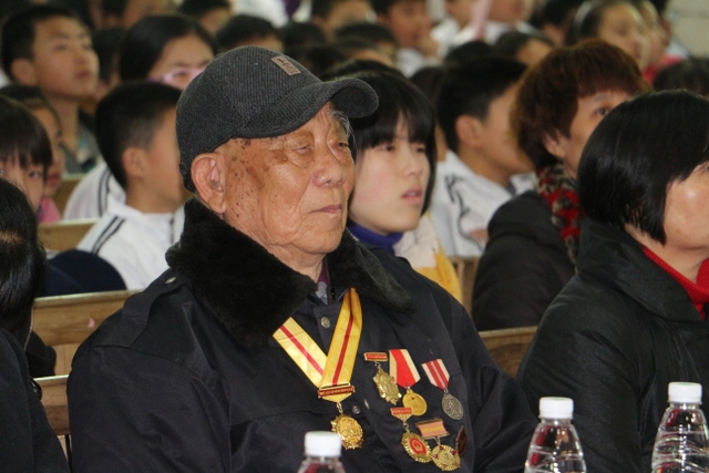 在雷鸣般的掌声中,抗战老兵谢甫合老爷爷和宋寿彭老爷爷,在耒阳市关工委顾问曹定乾,耒阳市关工委副主任谢秋生、资素月、曾晓秋等领导陪同下来到报告会现场(刘心安老爷爷由于身体原因未能出席)。两位老人已是耄耋之年,仍然目光炯炯、精神矍铄,依稀可见当年矫健雄姿。