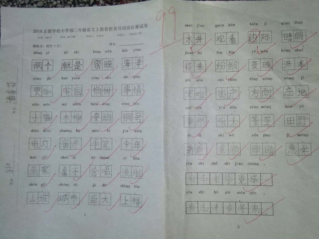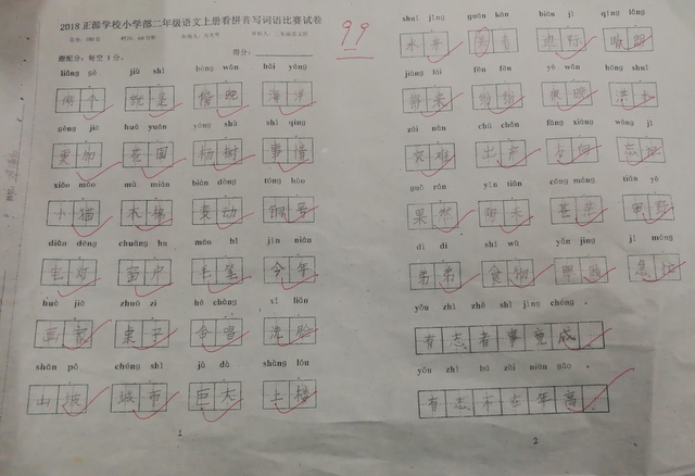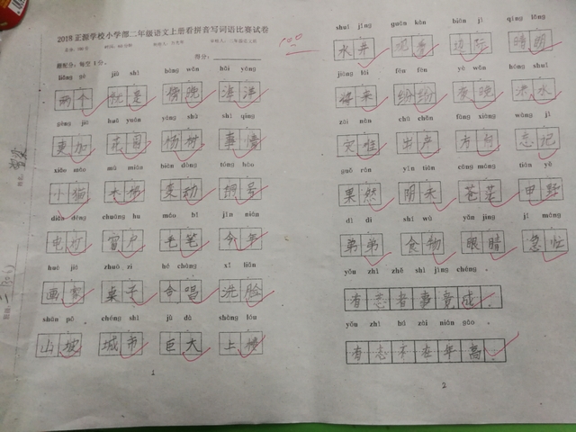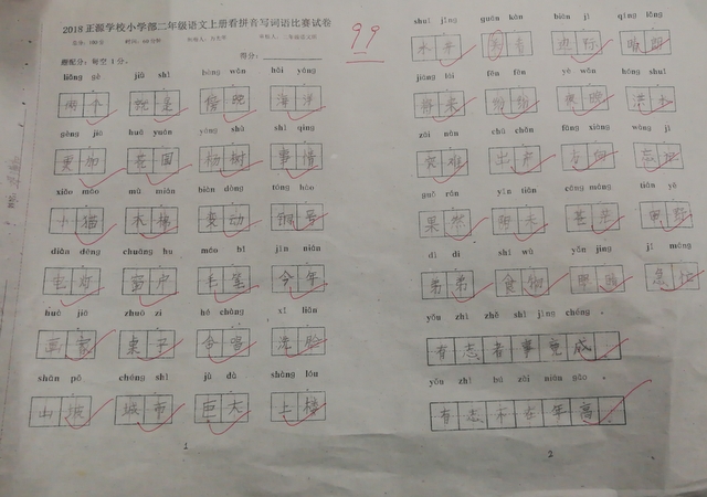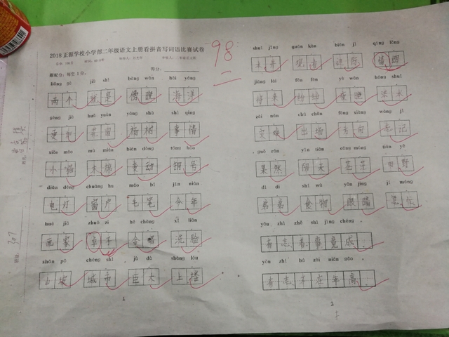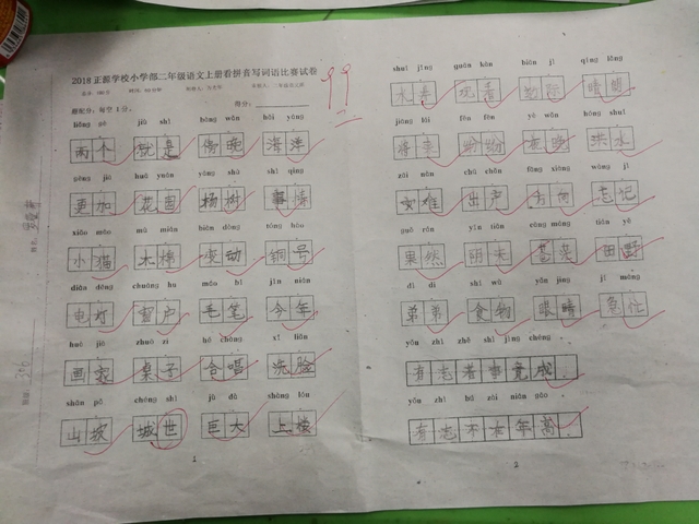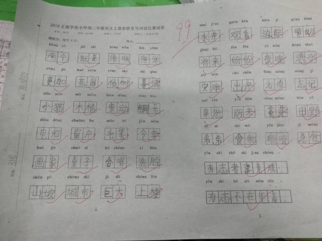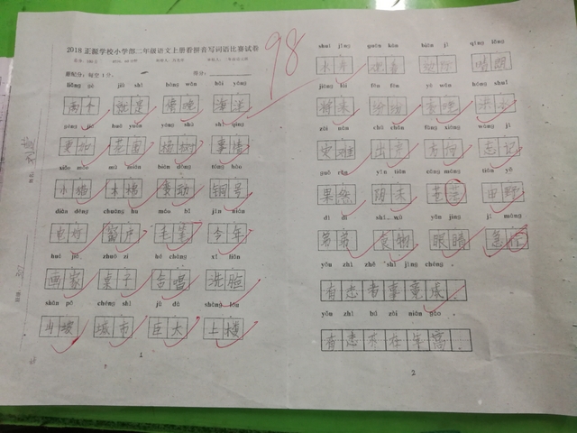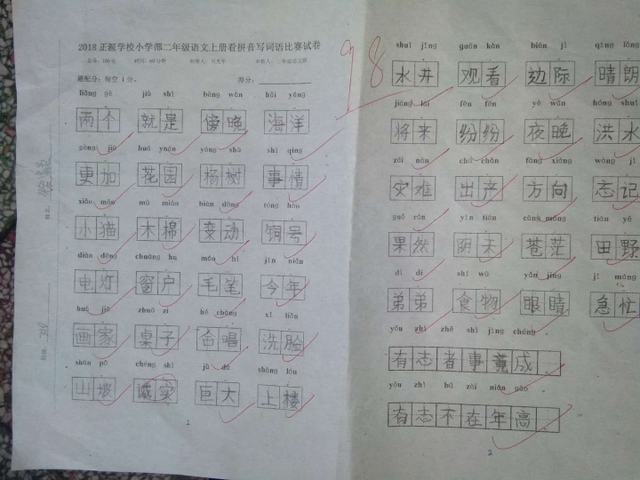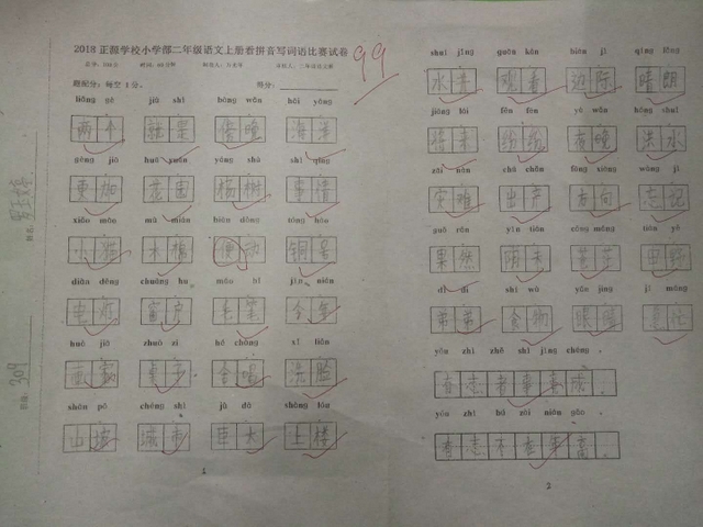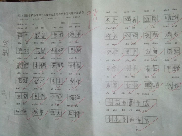 汉字是我们的国粹,写好汉字是每个中国人应该掌握的最起码的基本功。“字如其人”,“字正人正”。写字的过程,其实就是育人的过程。作为老师,加强写字教学,让我们的孩子从小写好字,做好人,是我们义不容辞的责任。而字词是小学语文低年级阶段的教学重点,是孩子们读文、行文的基础,在以发展学生语言为根本任务的语文教学中有着举足轻重的地位。临近期末,为了检测、了解孩子们本学期拼音、生字词的书写与积累的情况,丰富孩子们的词汇量,小学部二年级举行了看拼音写词语大赛。