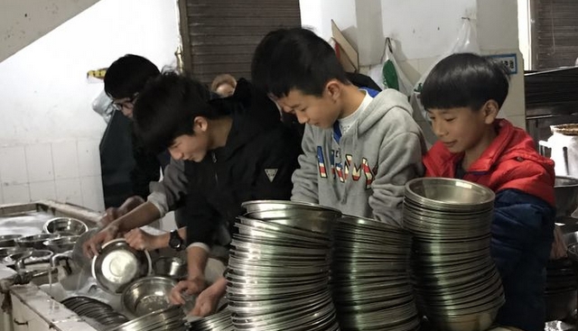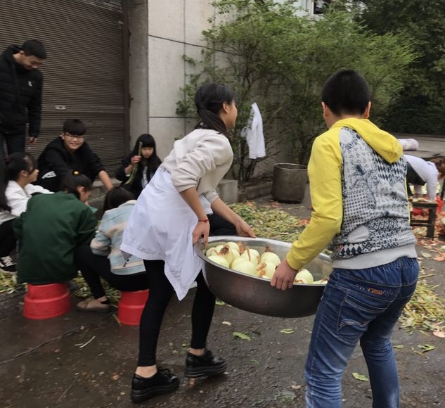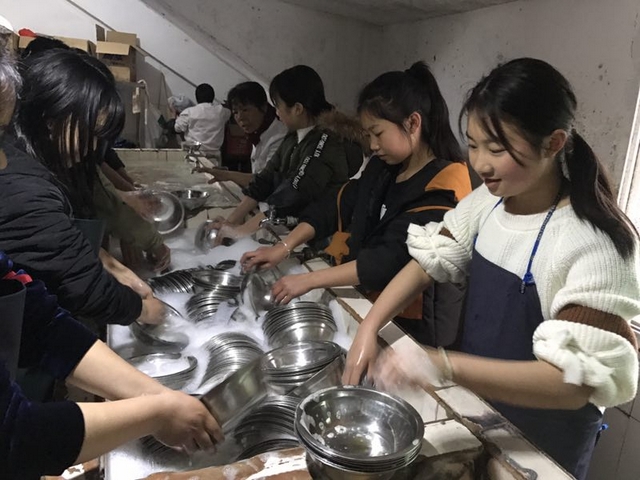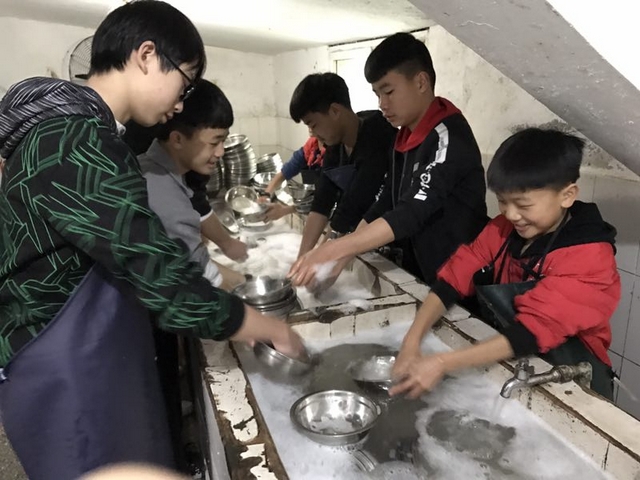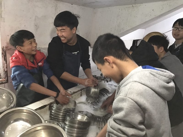择菜、洗菜的同学们,热火朝天,好似一道美丽的风景线。洗碗的同学们也是不甘示弱。首先,将碗放在水槽里,用洗洁精认真得擦拭一遍,然后再用清水冲洗两遍。看着一个个整洁光亮的碗,同学们不禁发出感慨,原来我们看起来普普通通的一餐饭,居然背后蕴含了如此多的汗水。